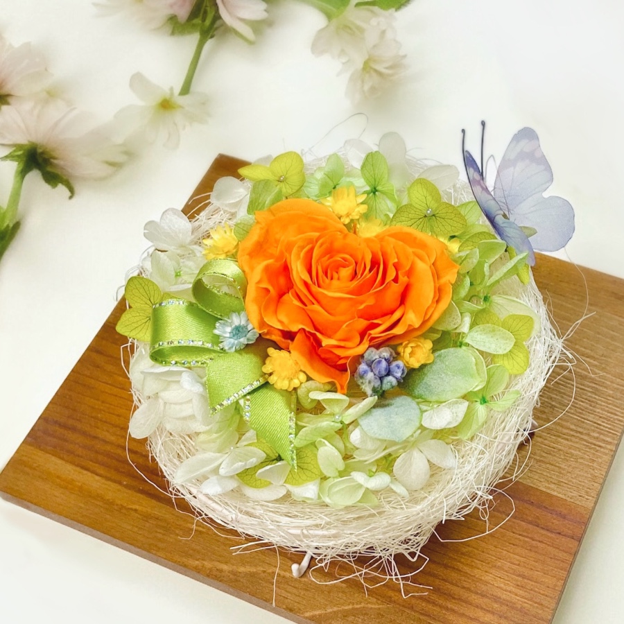 プリザーブドフラワーで作ったハートローズのアレンジとドライフラワーを封入したレジン雑貨を主に制作しています。