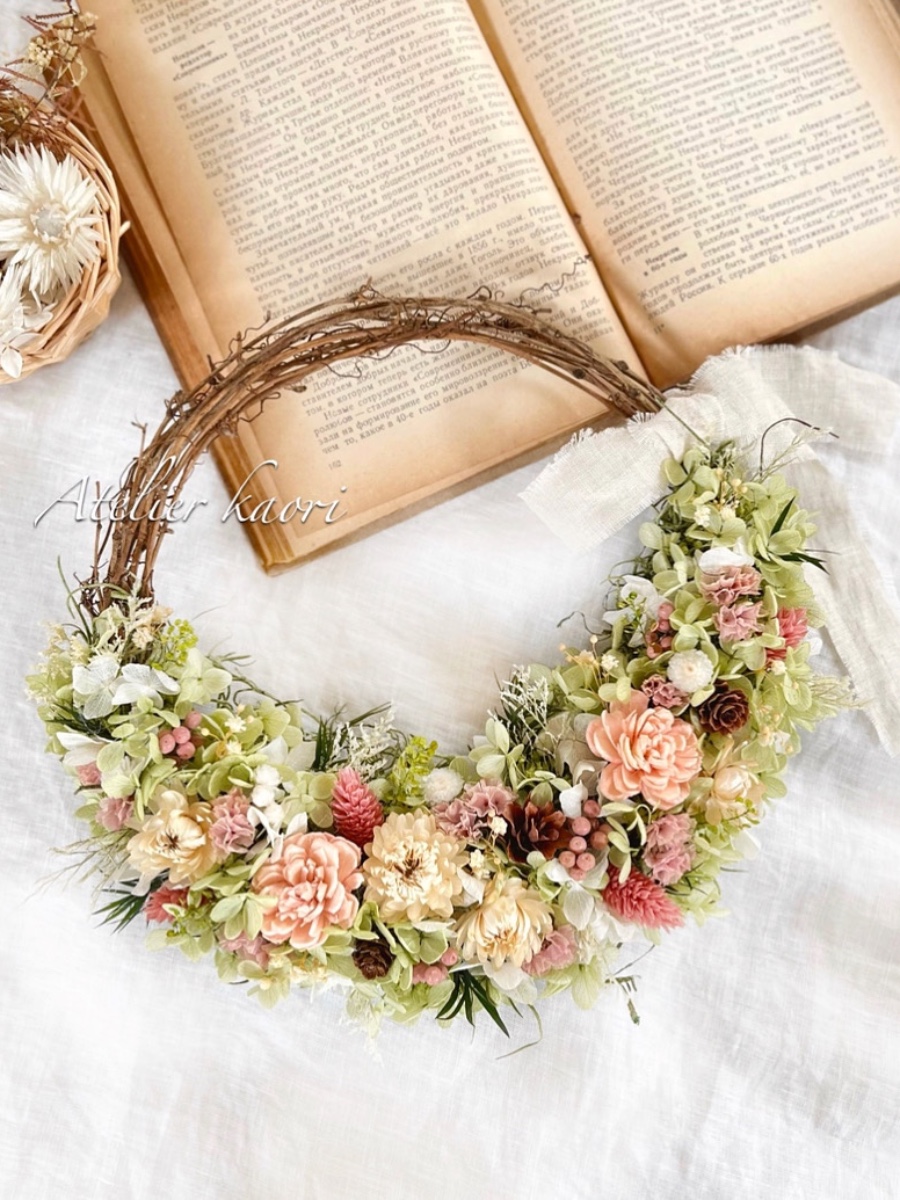 柔らかい色合いのお花や木の実などを取り入れナチュラルな雰囲気になっております。