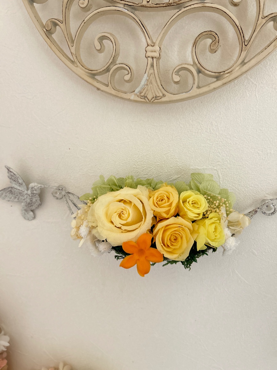 ハミングバードという可愛らしい名前のついたワイヤーの花器に黄色の大ぶりなバラ、小さなバラ、オレンジが鮮やかなジャスミン、イモーテル、紫陽花を合わせました。