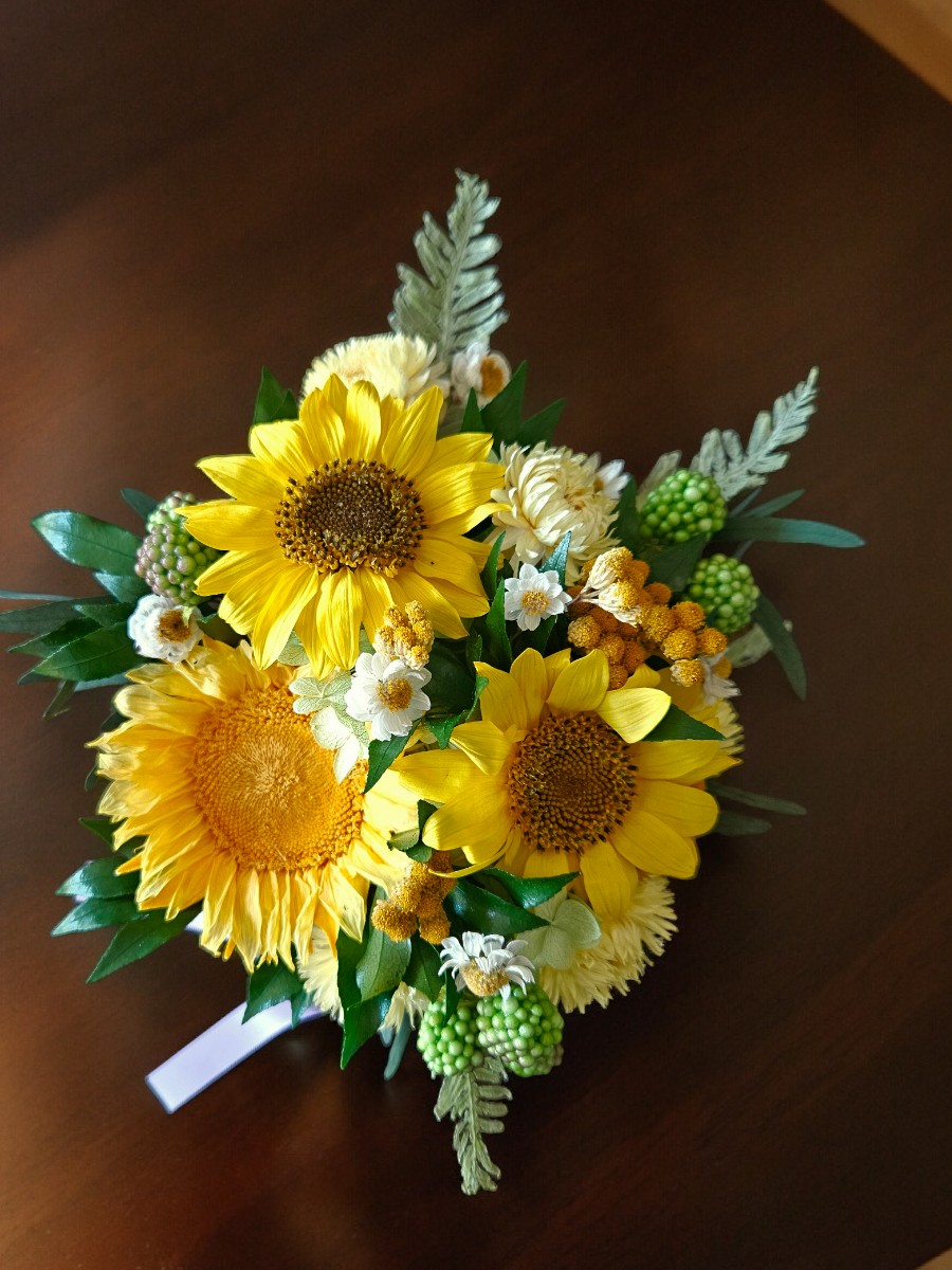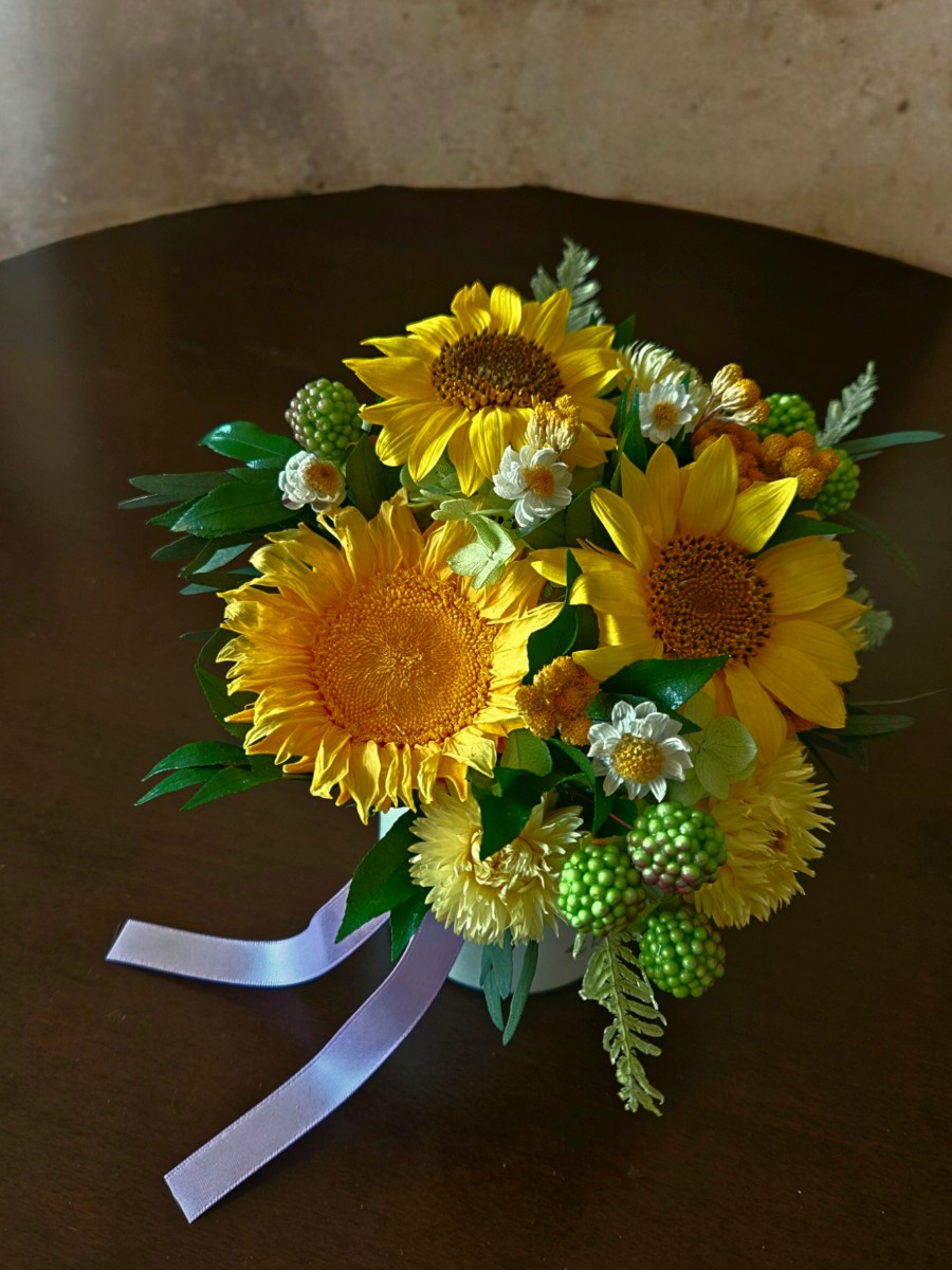 プリザーブドフラワーのひまわりとドライフラワーのヘリクリサム、ハナカンザシなどを束ねた夏らしいミニブーケ。