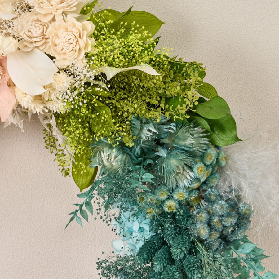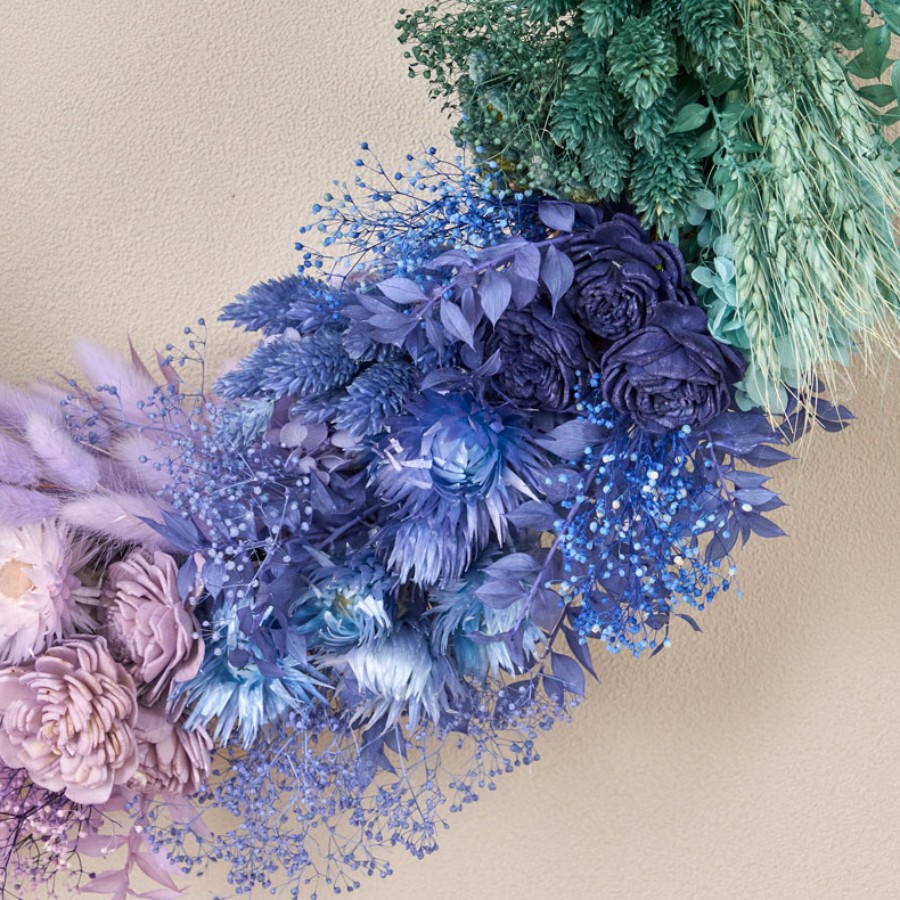 バリエーション豊富なカラードライを色別にグルーピングし、グラデーションになるようにアレンジしています。