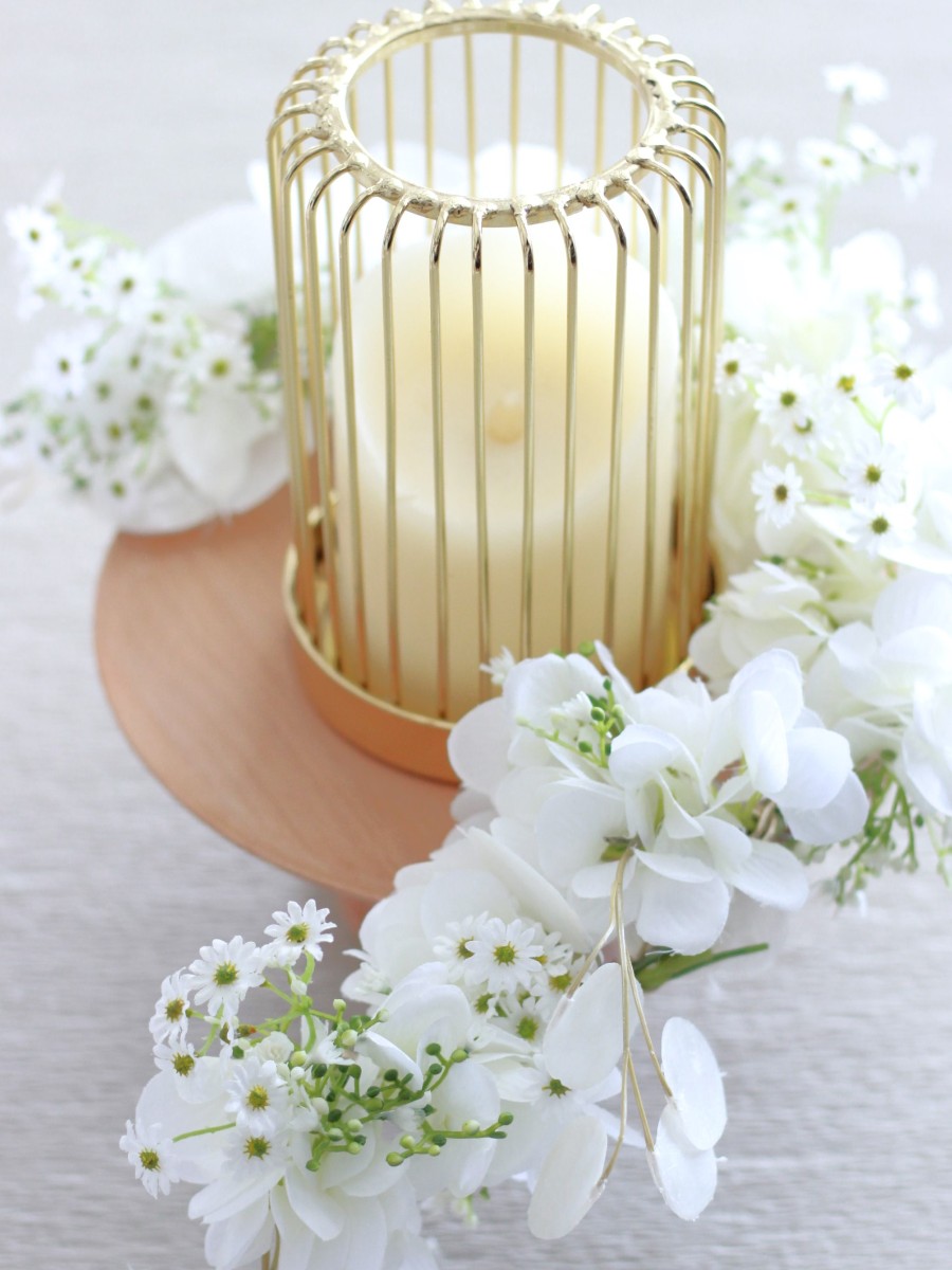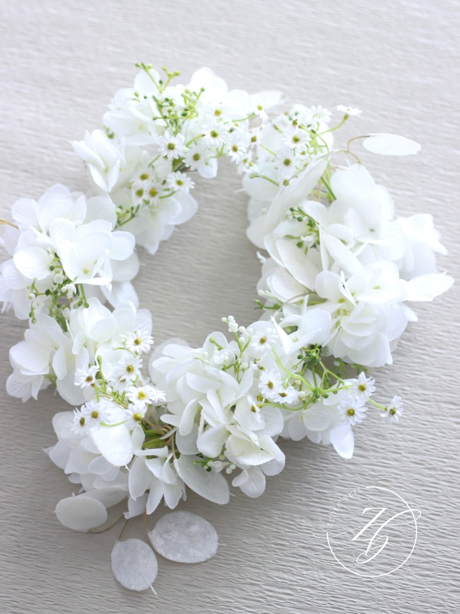 真っ白な紫陽花とルナリア、白い小花のシンプルなガーランドですが、ルナリアの控えめなキラキラで華やかになります。ゴールドのワイヤーは見えても綺麗なので、わざとワイヤーを見せても可愛いと思います。ワイヤーが柔らかいけどしっかりしているのでガーランドやリースとしてだけではなく、ヘアアクセサリーやディスプレイなど多用途に使えます。