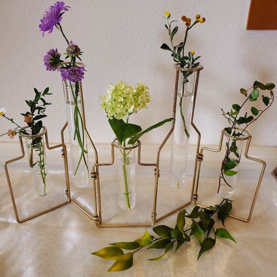 花瓶の形をしたワイヤーの中にガラスの一輪挿しがはいっています。