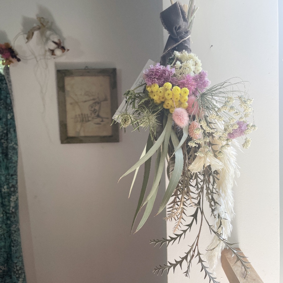 やさしい色味の植物を合わせて、明るい印象のスワッグを制作しました。
