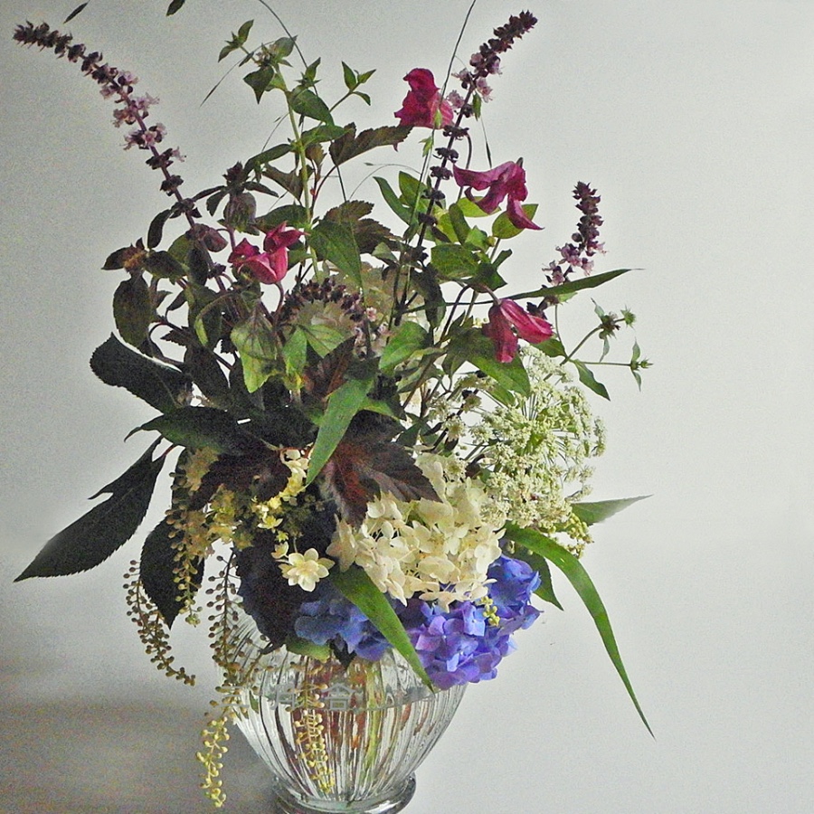 アナベルやアジサイ、リョウブなどの初夏ならではの花木と、バジル、マウンテンミントなどの香りの良い草花をガラス花瓶に投げ入れしました。