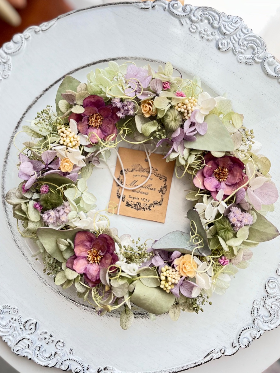 くるんとした動きが可愛らしいカーリーモスをベースに、ユーカリや紫陽花、ライラック系のお花を散りばめたシックなリースです。