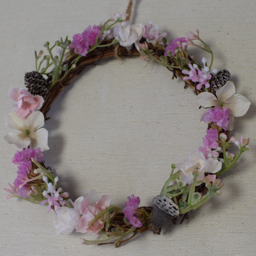 アーティフィシャルフラワー・ドライフラワー・木の実を使って、ナチュラルなリースを作りました。