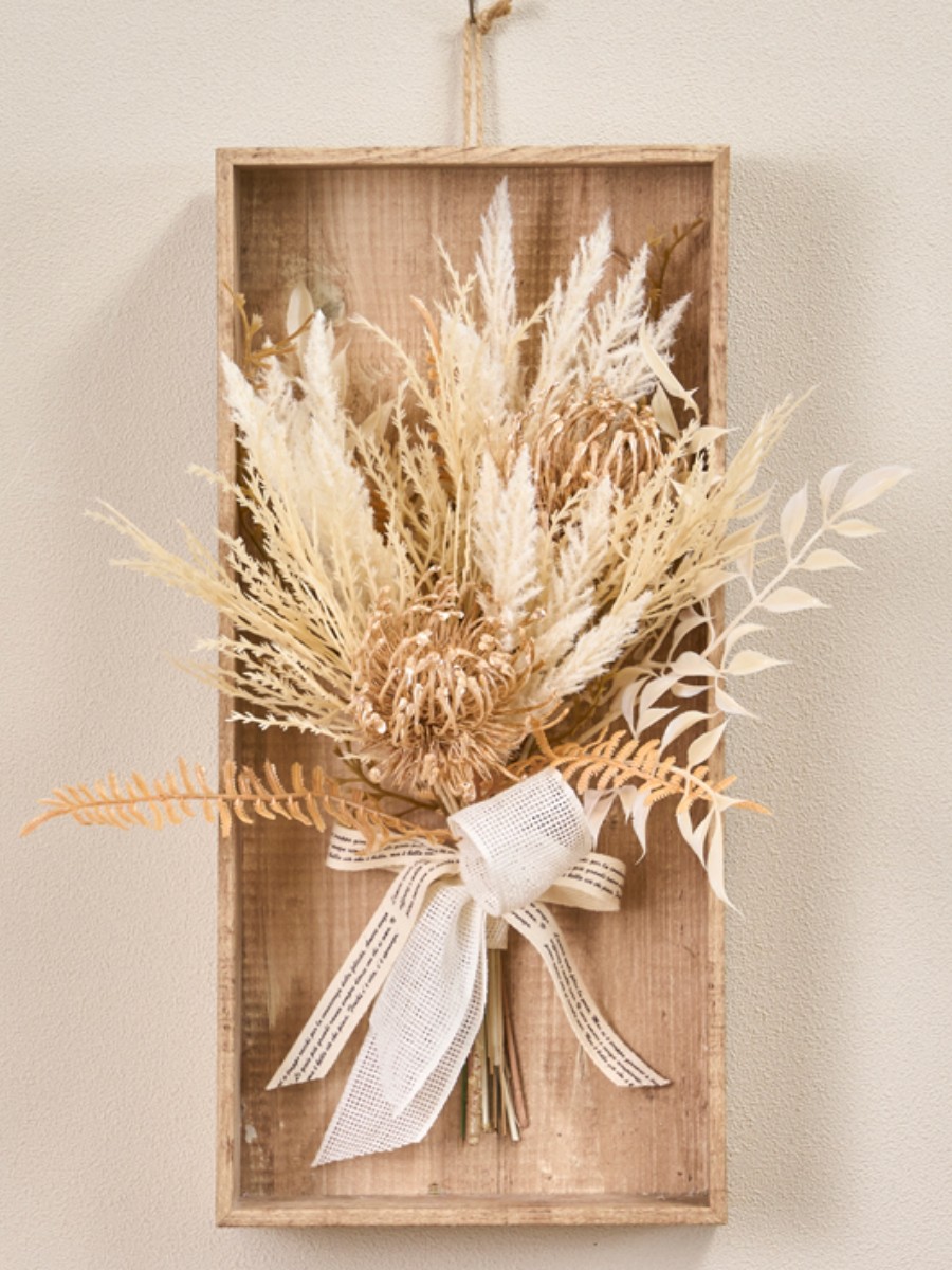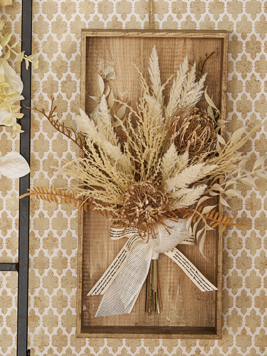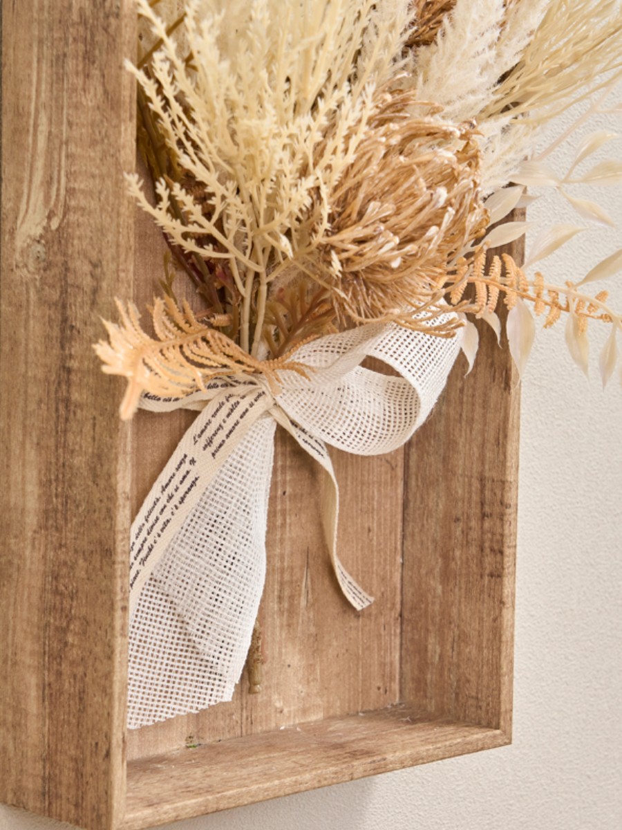 ナチュラルな雰囲気のウッドフレームに合わせたドライアレンジに見えますが、実はこの花材、アーティフィシャルフラワーなんです。