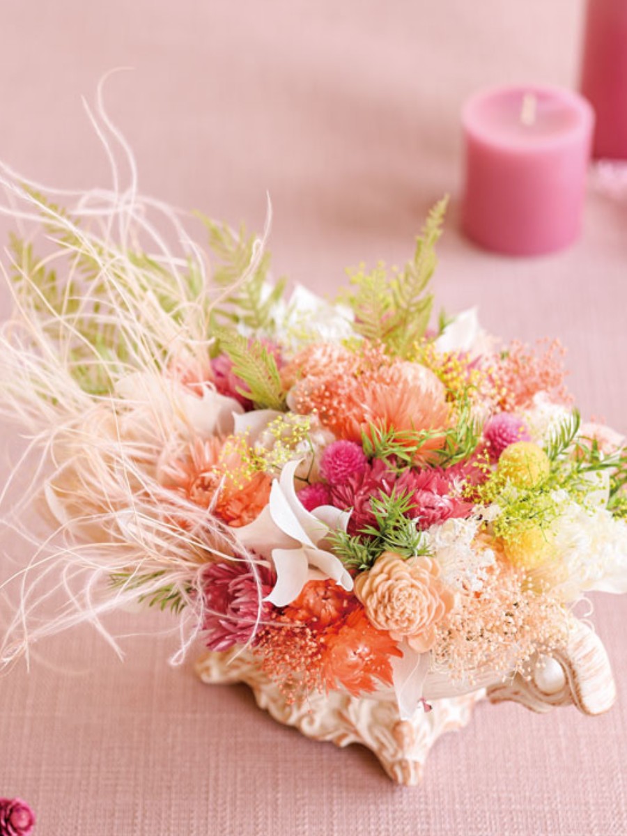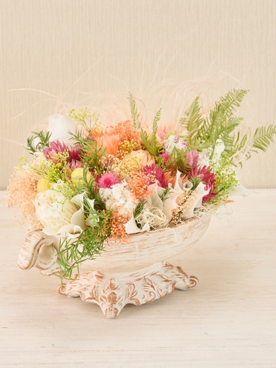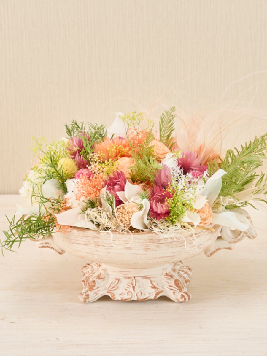 可愛らしい色合いの花材もデコラティブな器の効果でヨーロピアンな印象に仕上がります。
