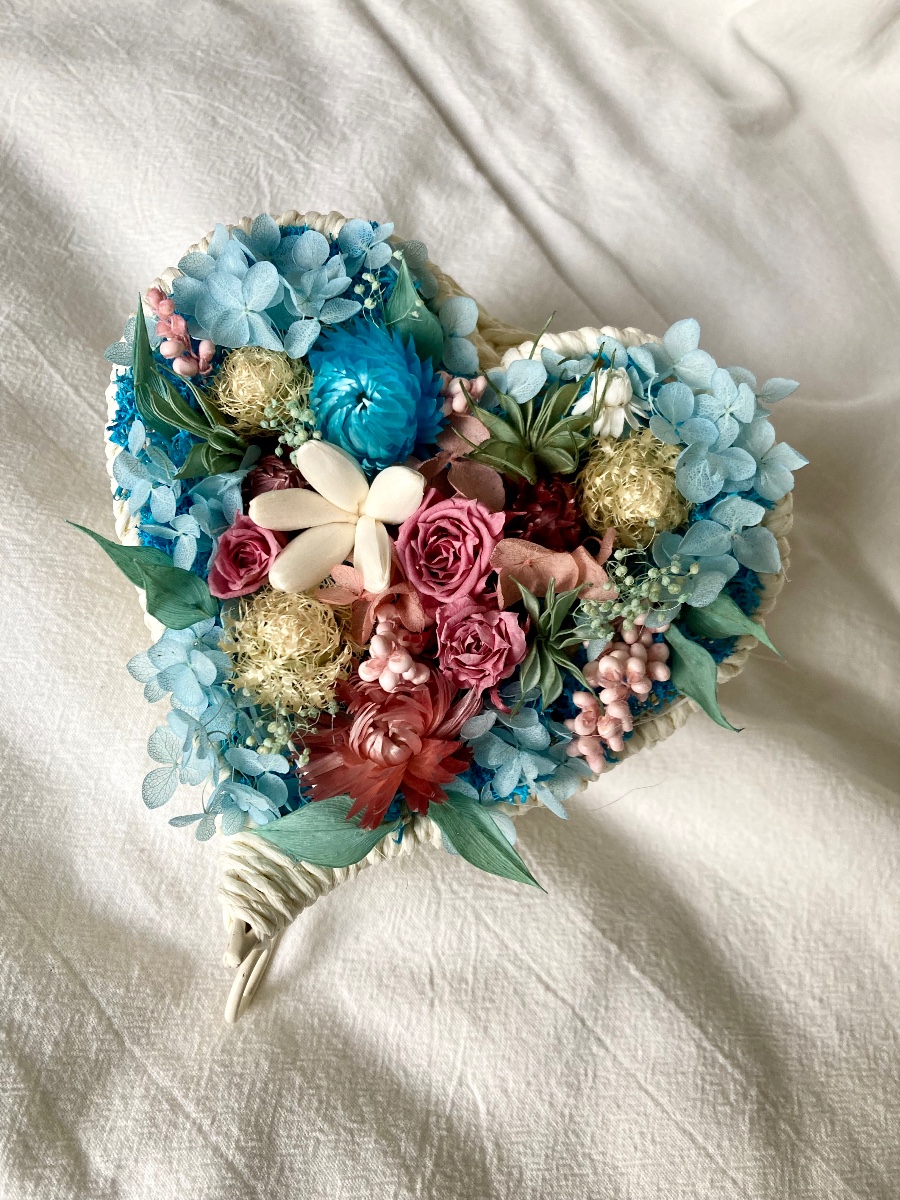 ぷっくりと可愛いハート型のバスケットのアレンジ。夏の海を感じてもらえると嬉しいです♡
