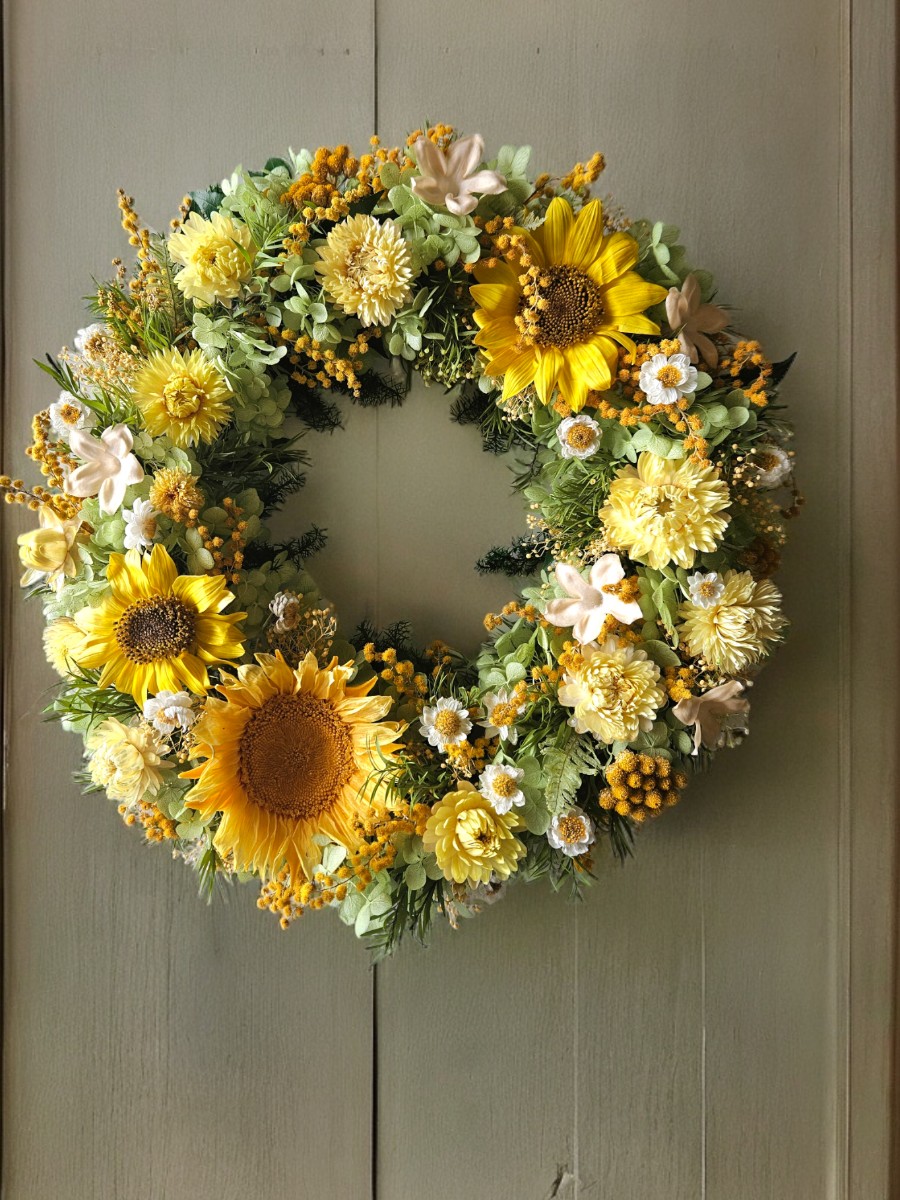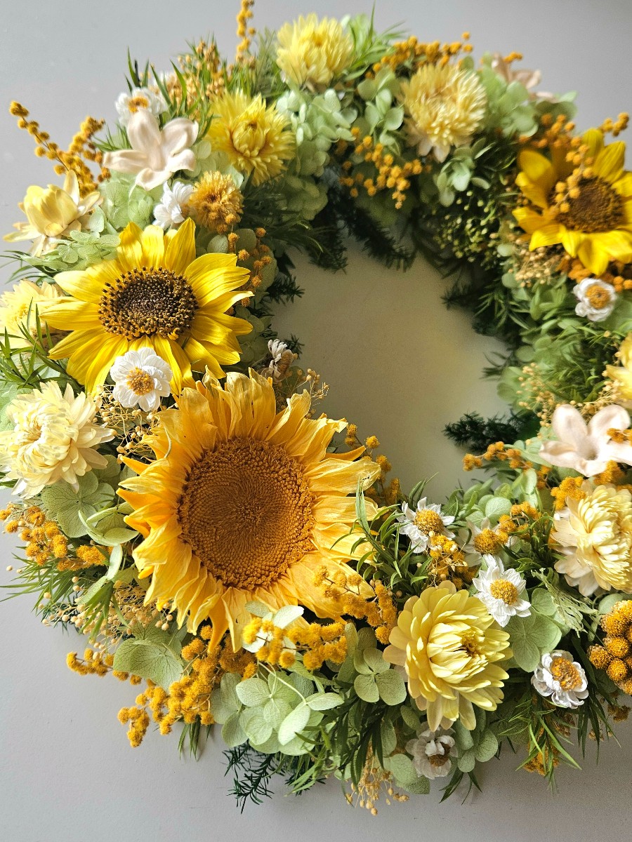 2種類のプリザーブドひまわりをメインにした、明るく元気の出るようなドアリースです。