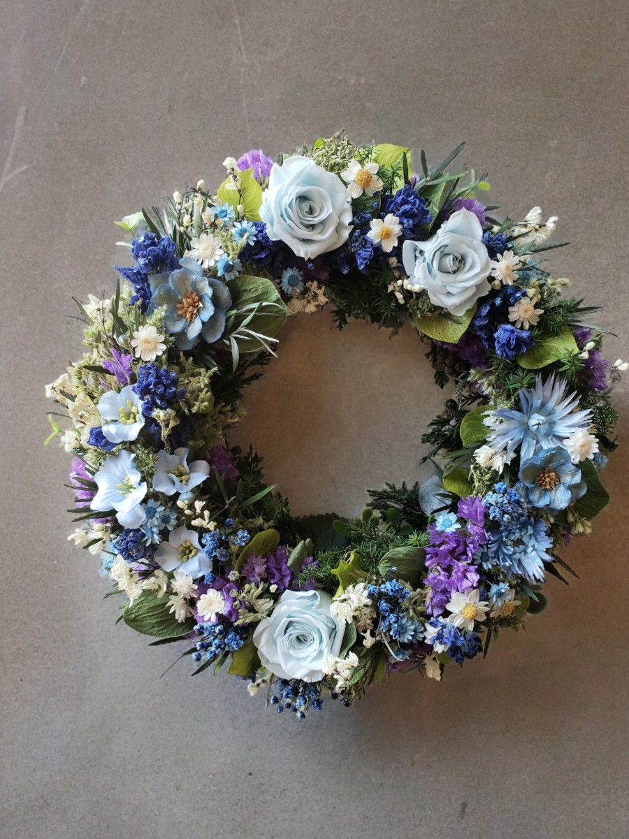 プリザーブドローズとソラフラワーのアネモネ、ドライのデルフィニウム、カラードライのスターフラワー、アーティフィシャルフラワーなど…違う素材を合わせたフラワーリース。