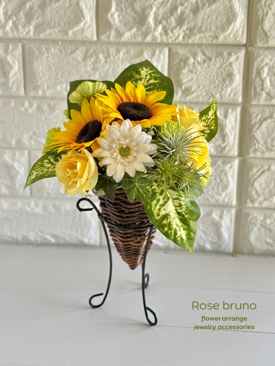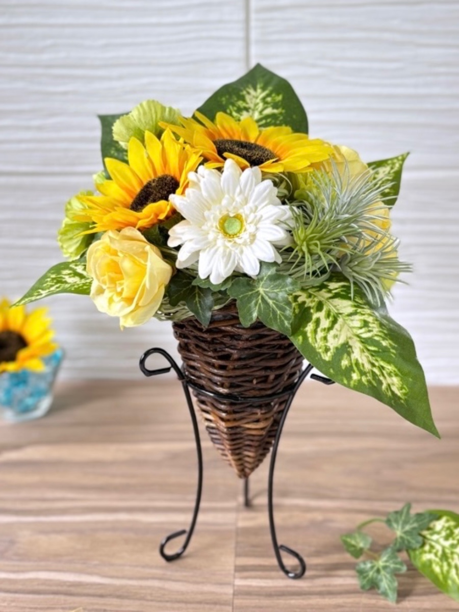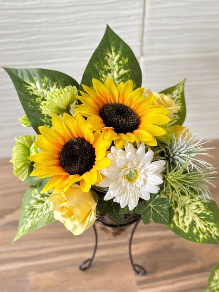インテリアに人気のエアープランツ&観葉植物『フェイク(造花)』 を夏の花のひまわりと合わせて、涼しげで季節感の溢れるアレンジにしました♡
