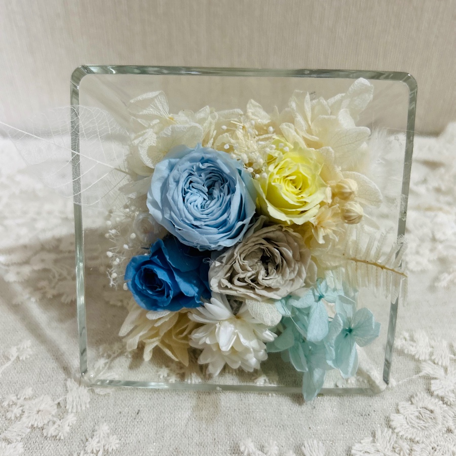 ガラス製のフレームに涼しげな色合いのプリザーブドフラワーのバラをアレンジしました。