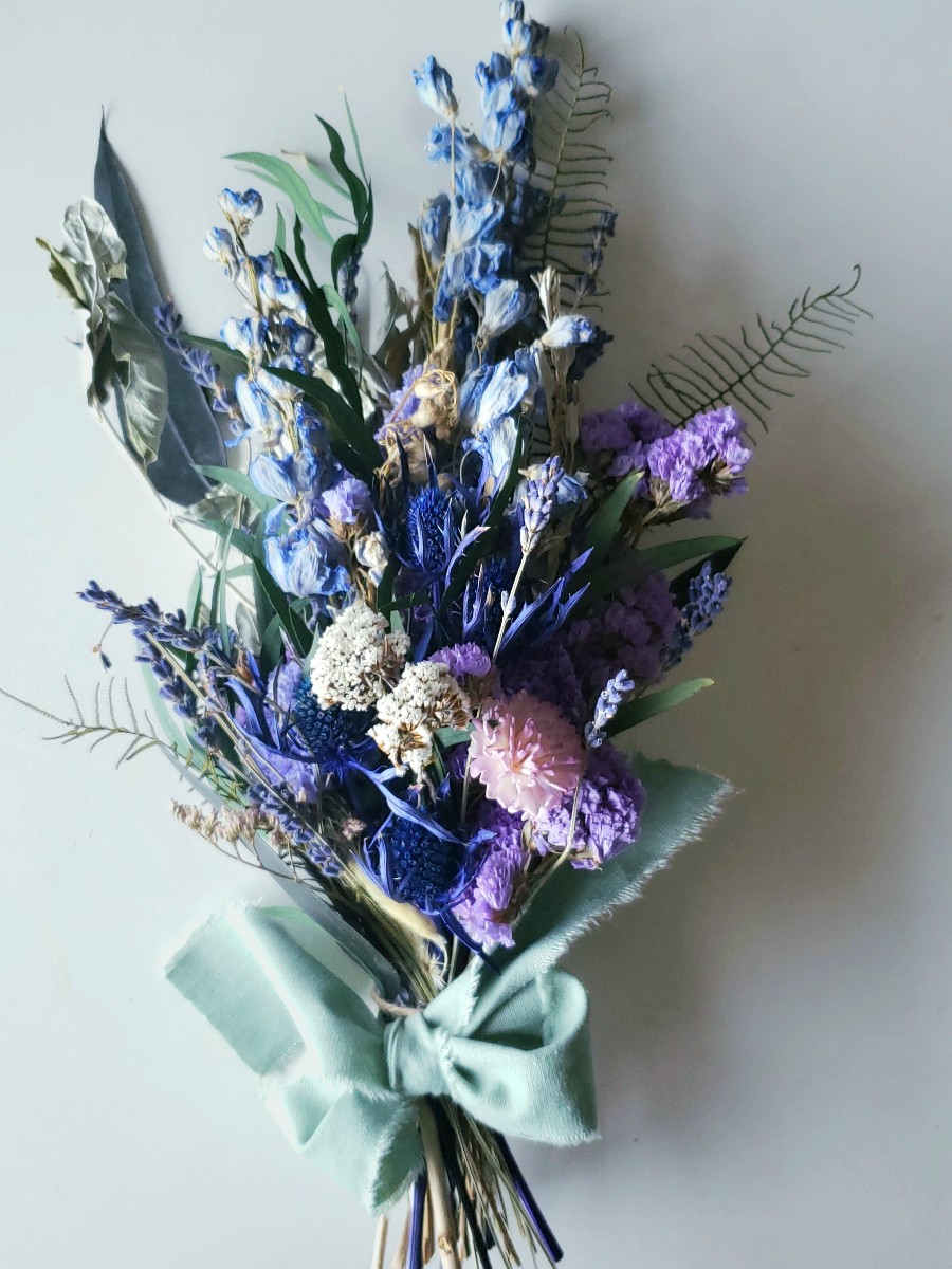 デルフィニウム、スターチス、ラベンダー、プリザーブドのエリンジウム…余った青や紫のドライフラワーやプリザーブドフラワー花材をラフに束ねたスワッグブーケ。