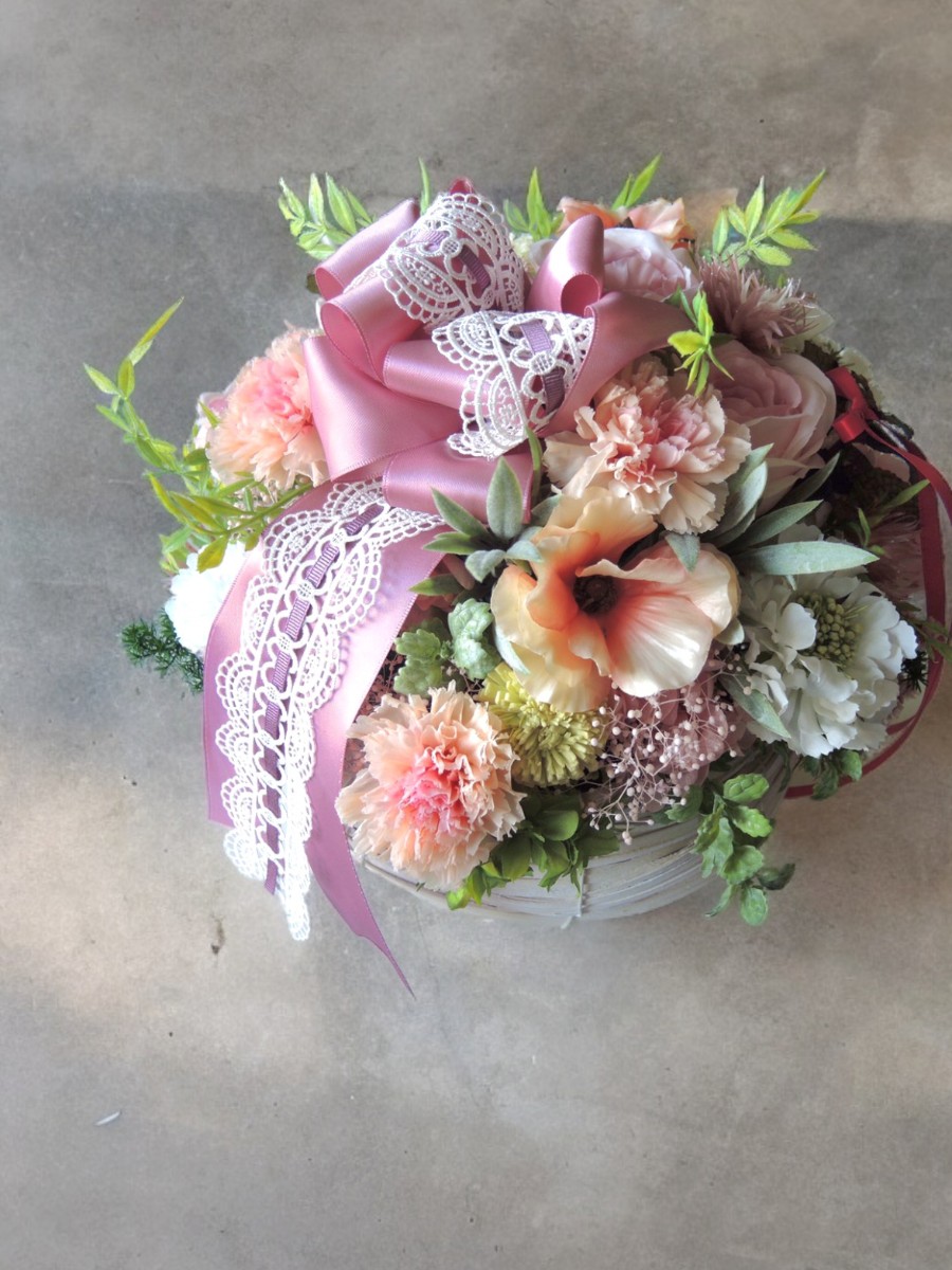 そんなオーダーでお作りした、アーティフィシャルフラワーのバスケットアレンジメント。