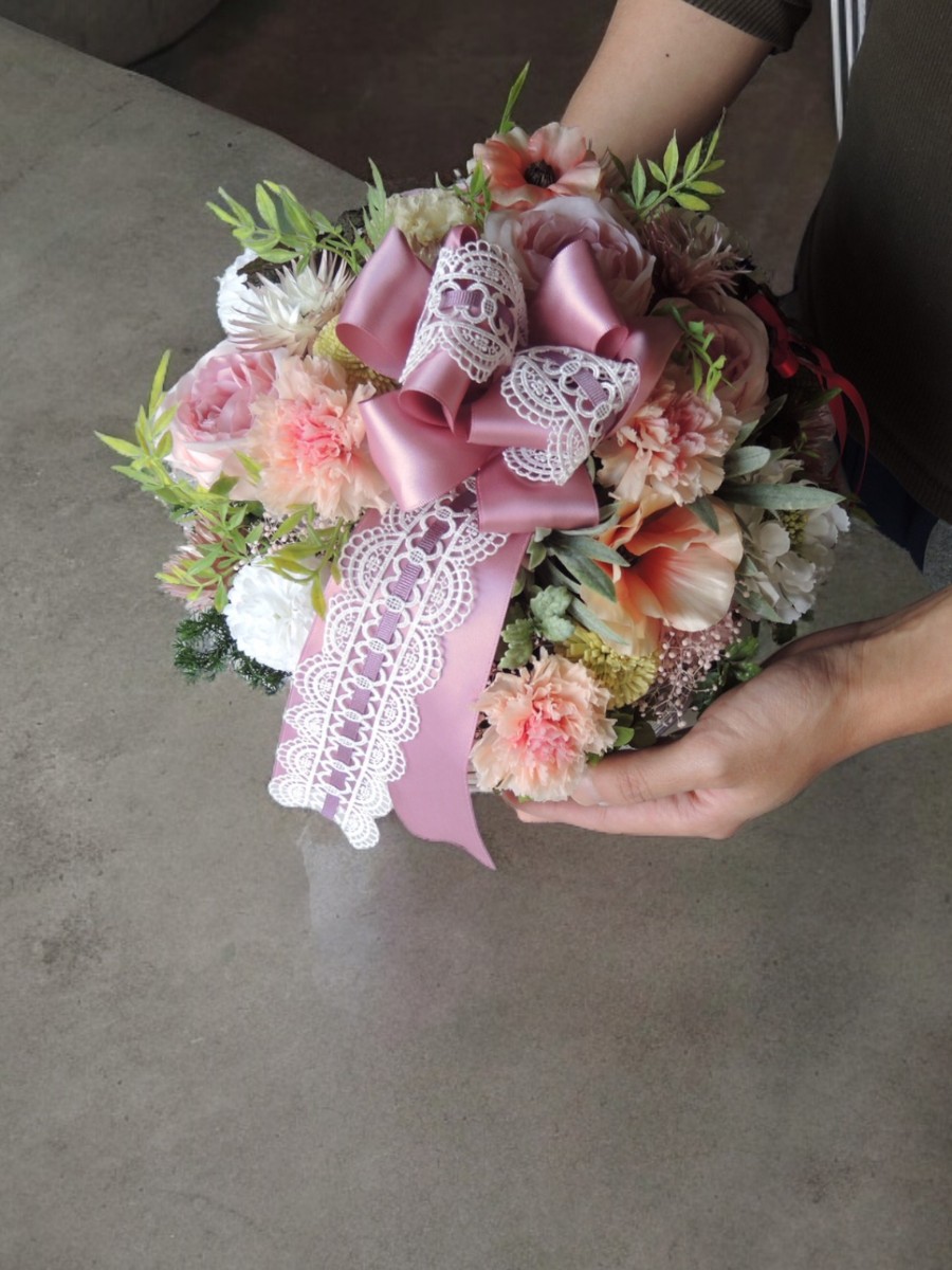アーティフィシャルの中にプリザーブドフラワーのカーネーションやカスミソウ、繊細な葉ものを合わせて表情を出しました。