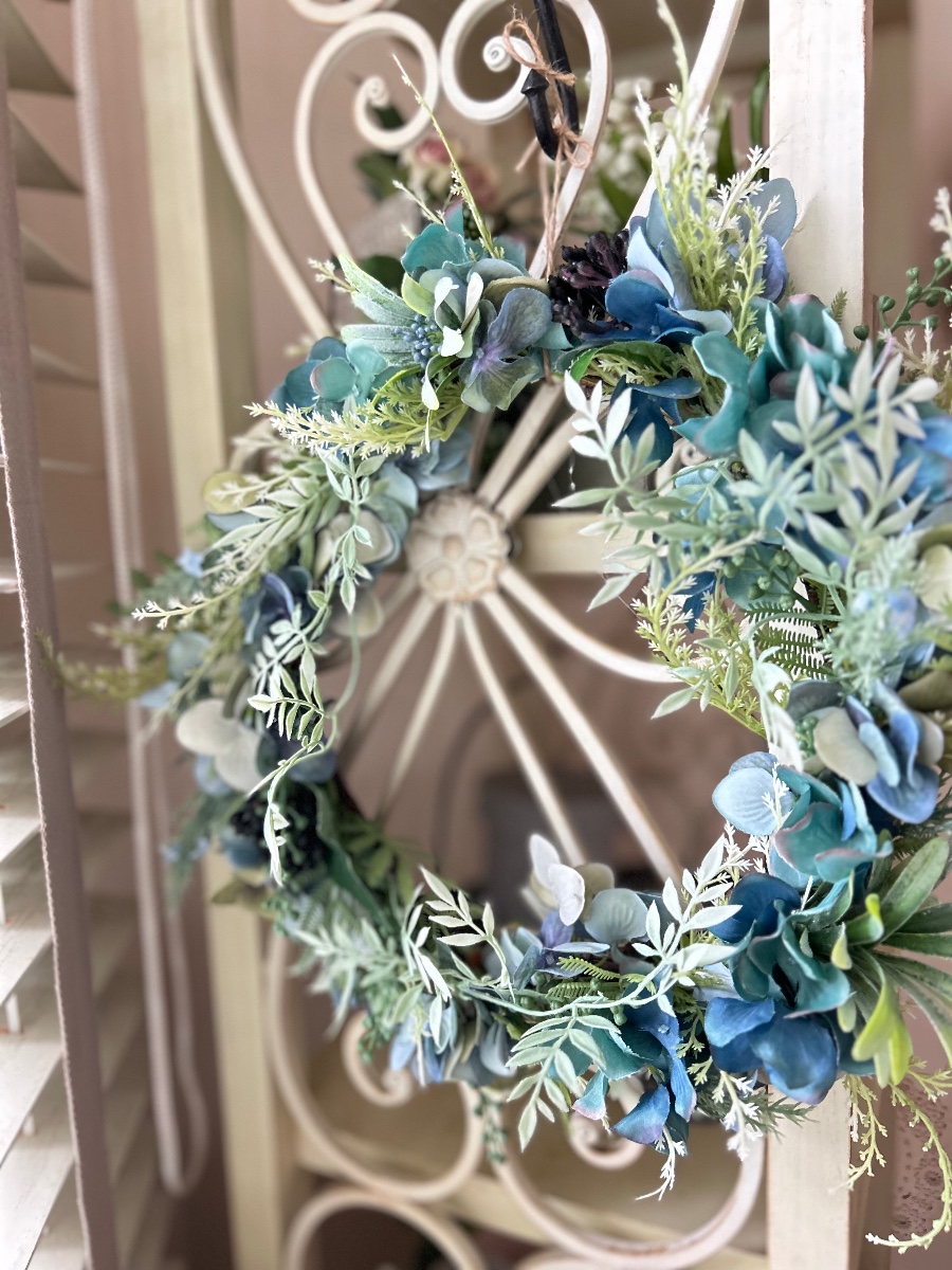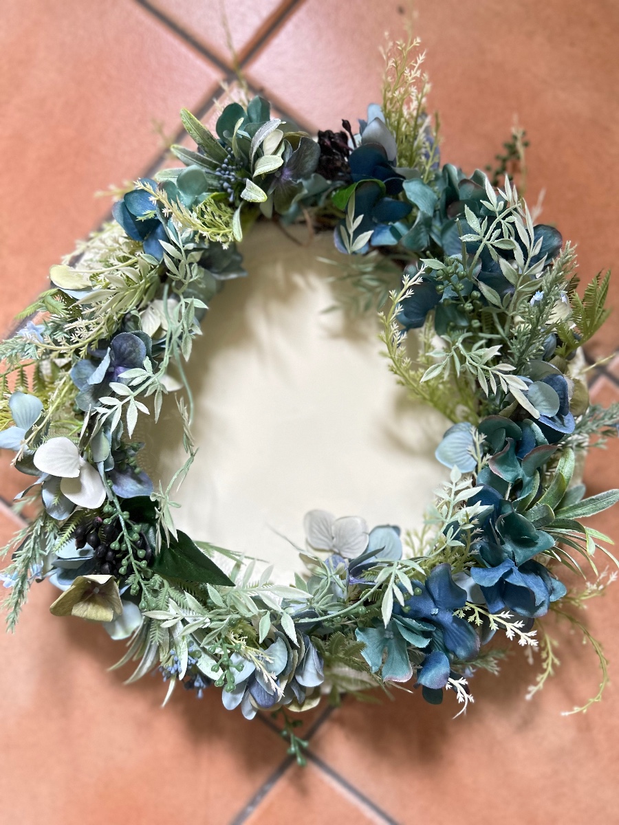 アーティフィシャルフラワーのアジサイとアカシアのリーフを使い、爽やかな夏のリースを作りました。