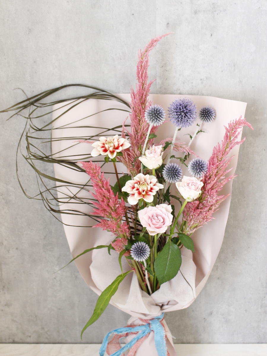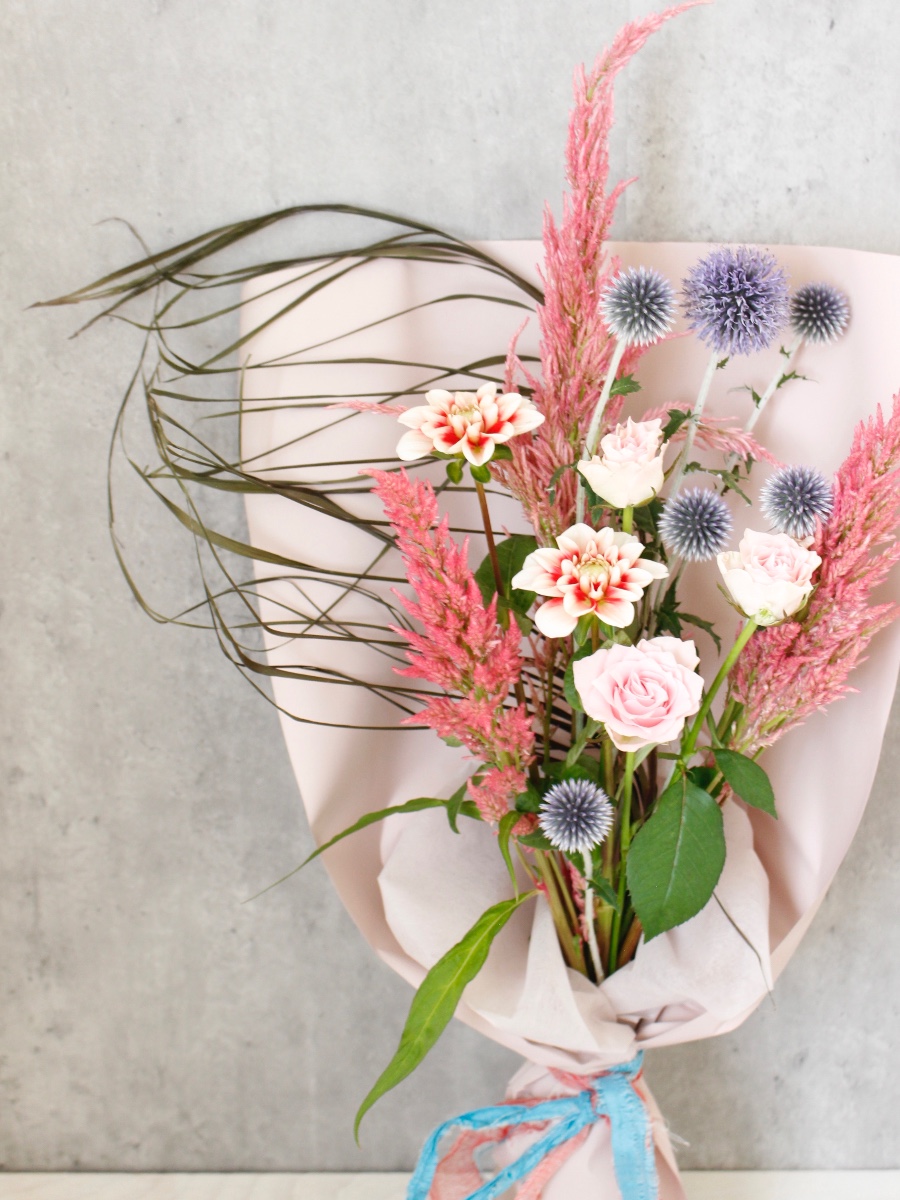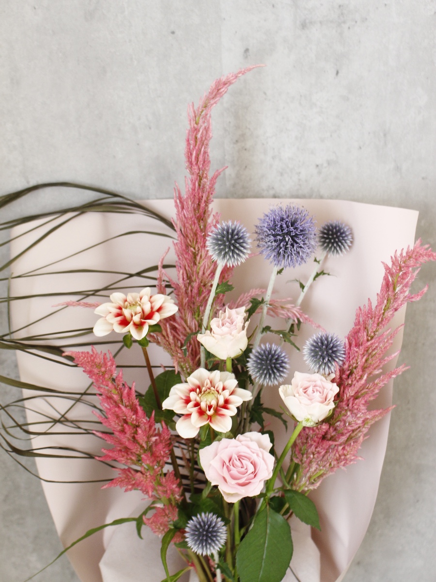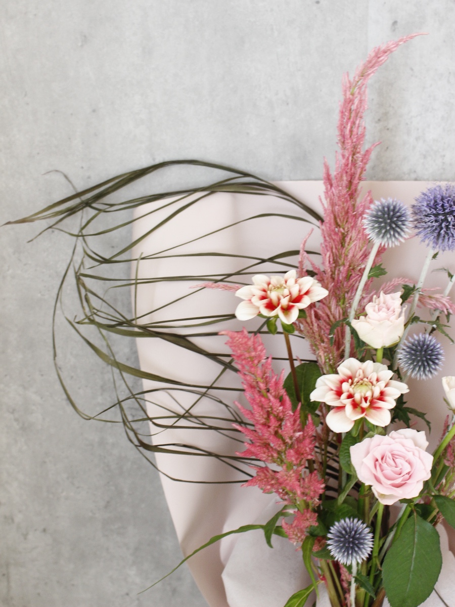 生花にドライのドラセナブラックタイを合わせて、シックな印象の花束に。