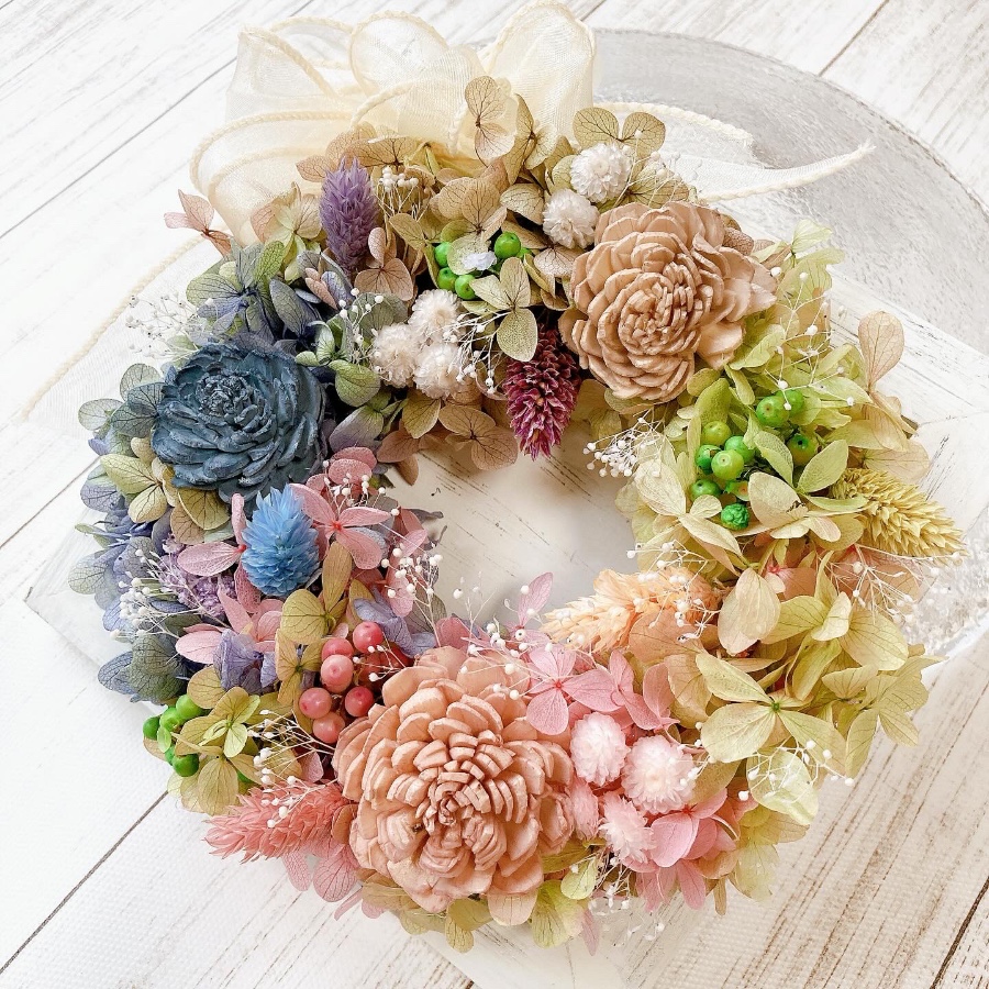 グラデーションを意識したリースを飾る場所を選ばないようにフレームにアレンジしました。