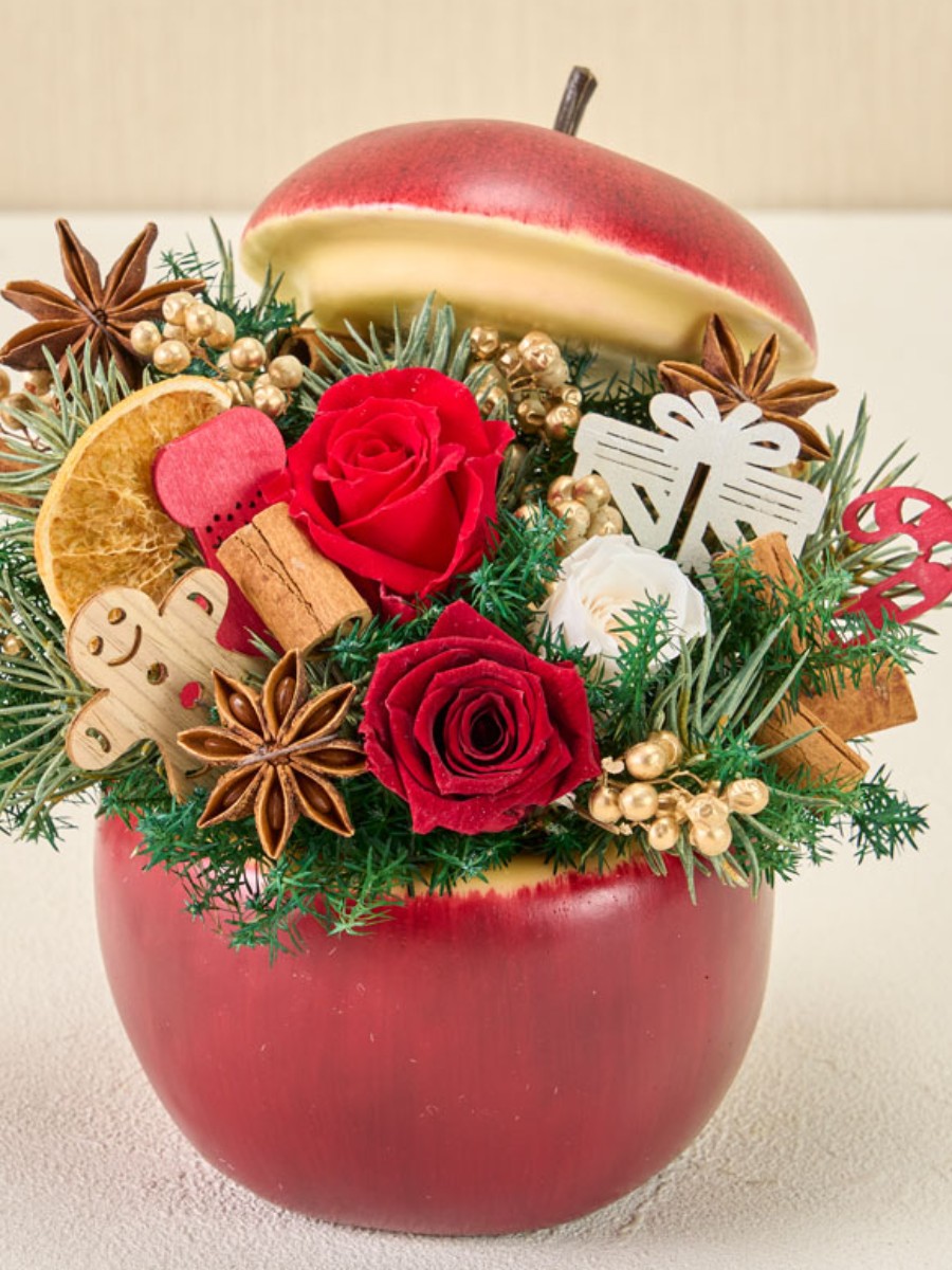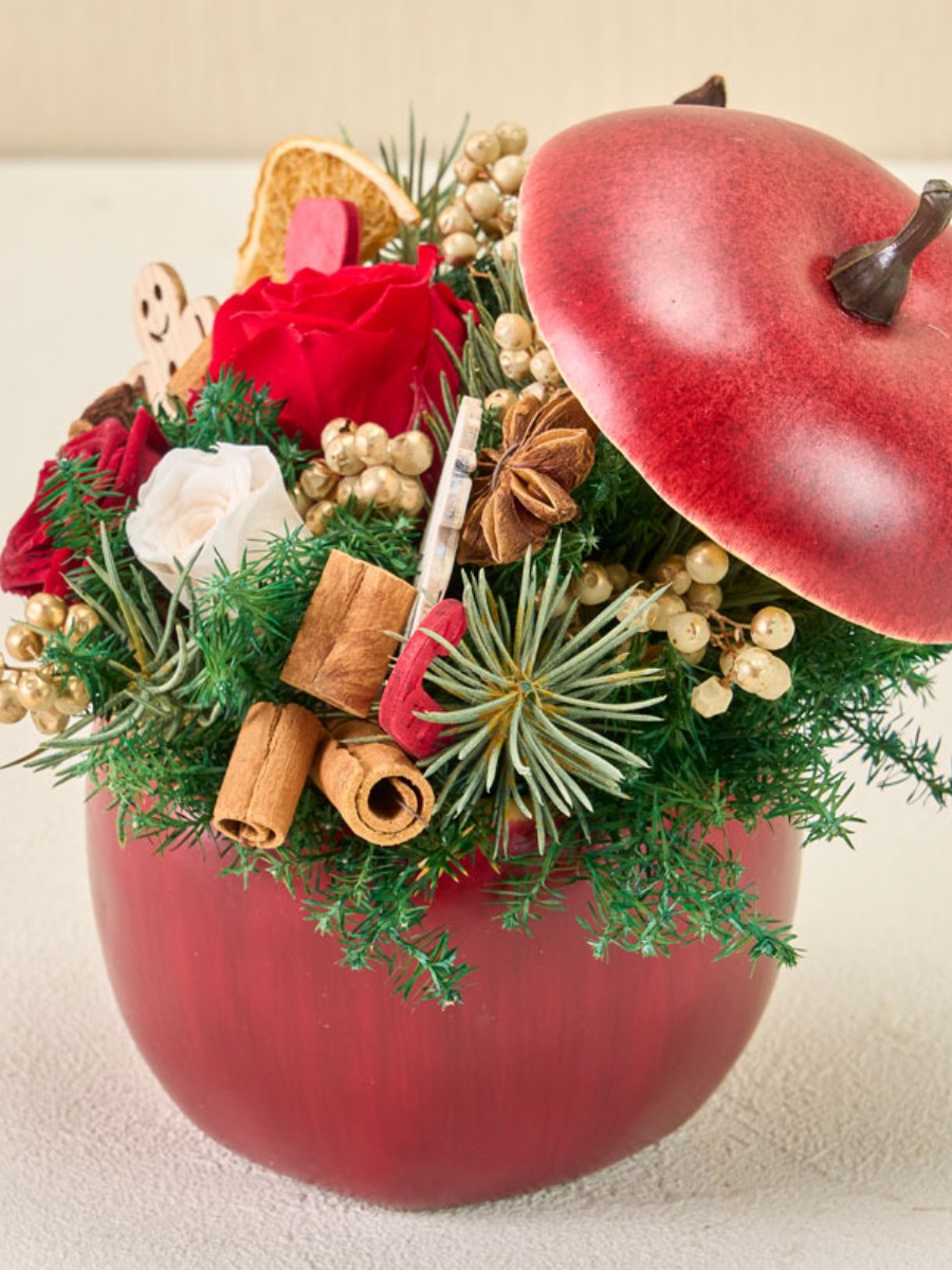 フタ付きアップルの蓋にワイヤーを付けてレインボーフォームに挿し固定しています。(発砲スチロールなので簡単に挿せます)
