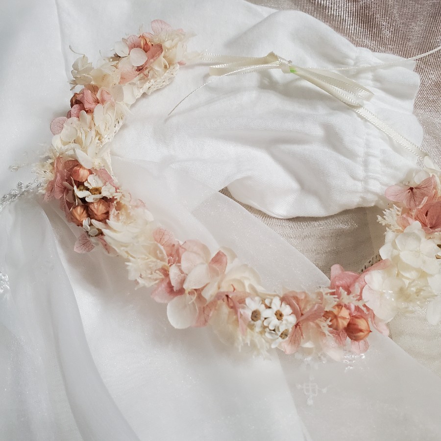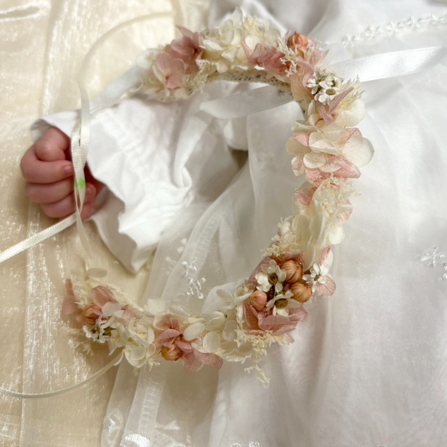 小さな天使ちゃんにほんわか色した花かんむりをプレゼント。