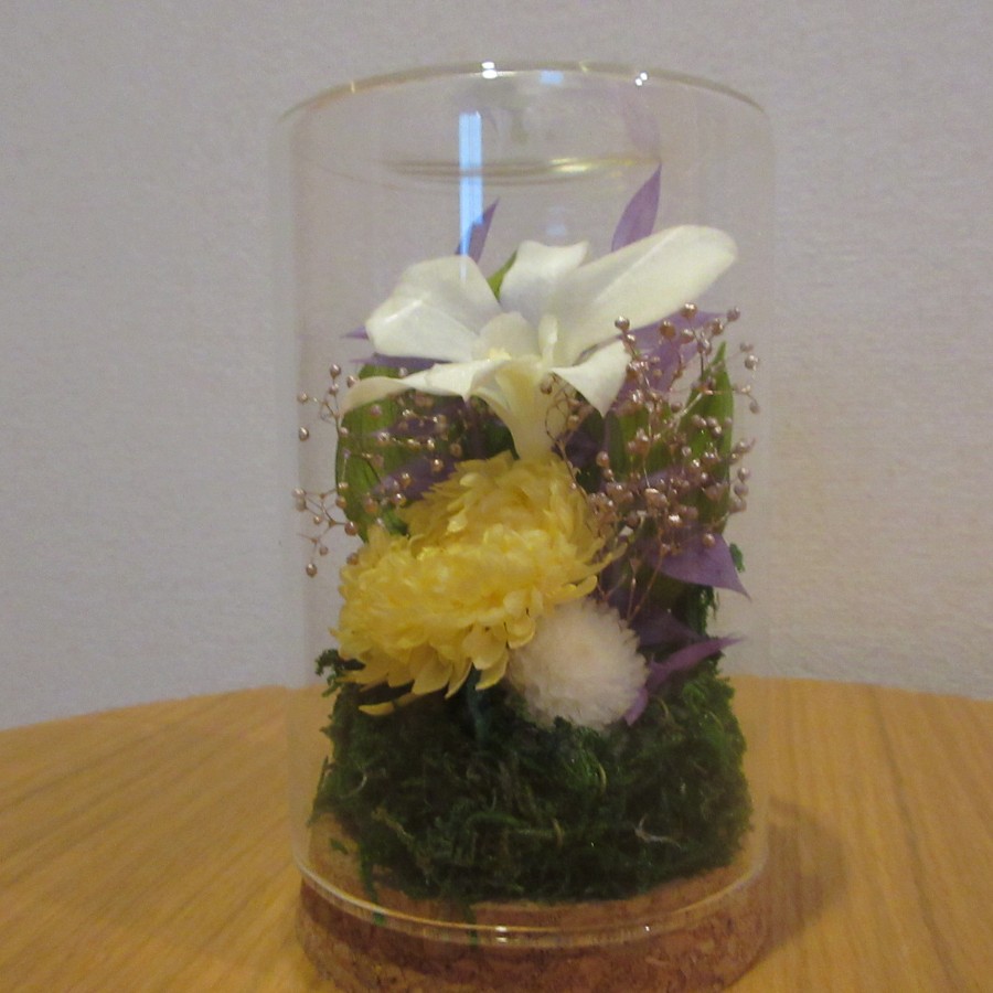 お手入れ要らず、花にホコリもつかないガラス容器入りです。