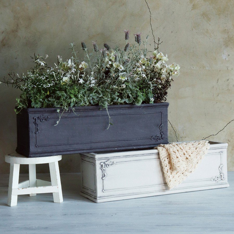 奥行きのサイズを気にすることなく、花苗を束ねたユニットを4〜5個横に並べて植えるだけで簡単に綺麗な寄せ植えができるグラスファイバー製の植木鉢です。