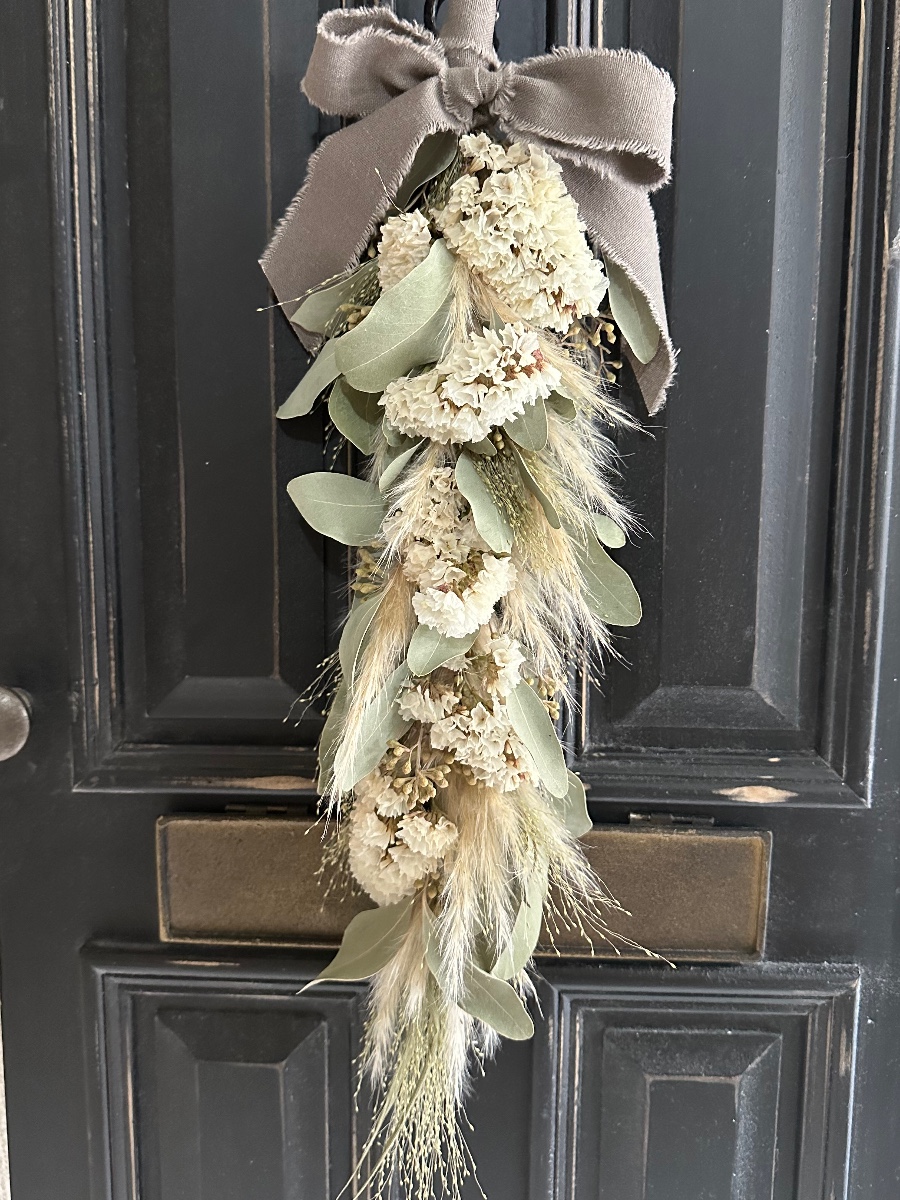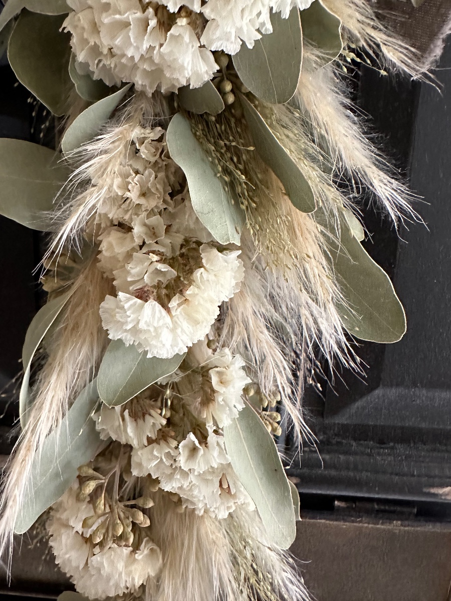 白のスターチスとポプラスベリーにフワフワのパンパスグラスやスモークグラスで優しい色合いに仕上げました。