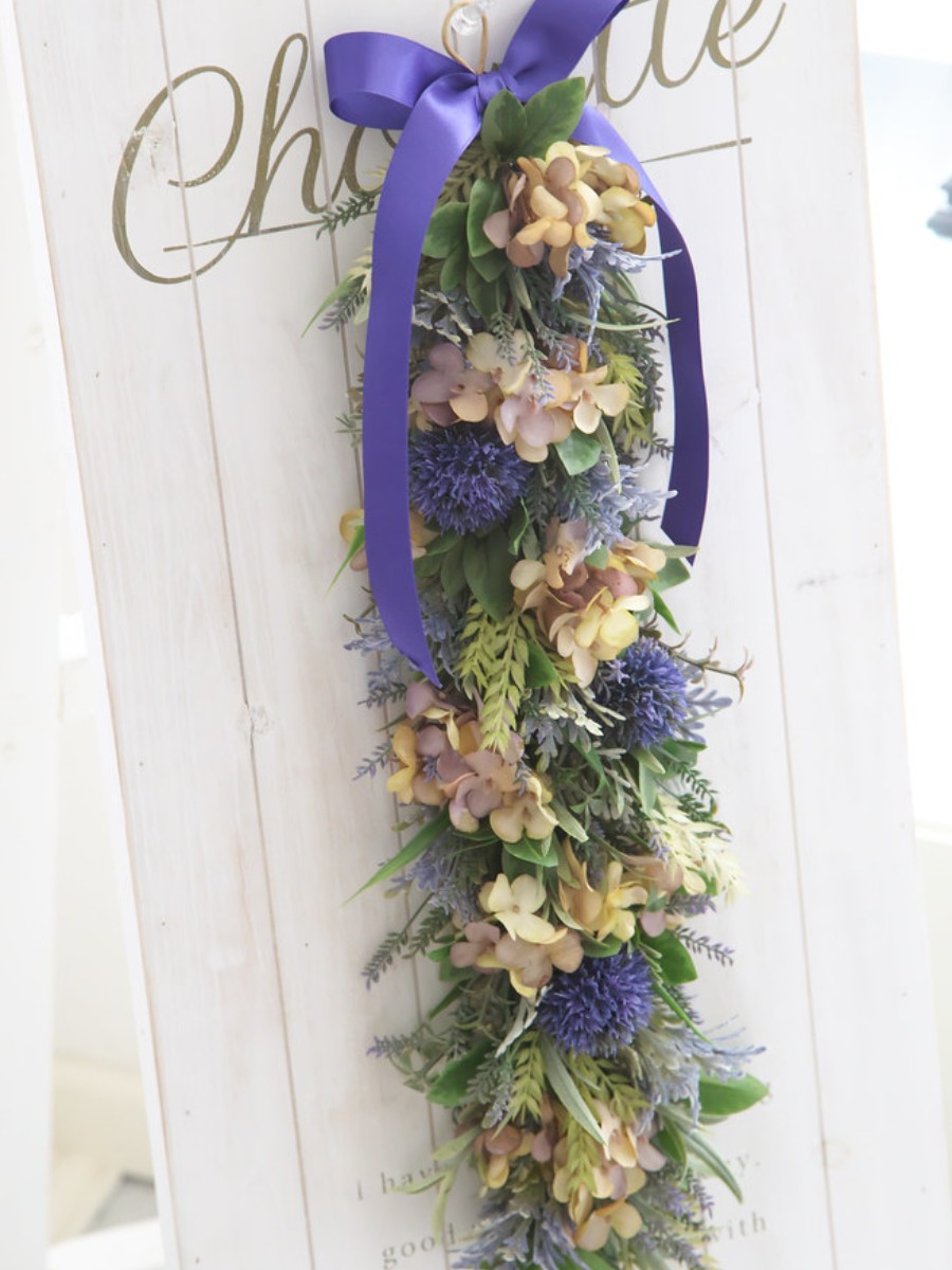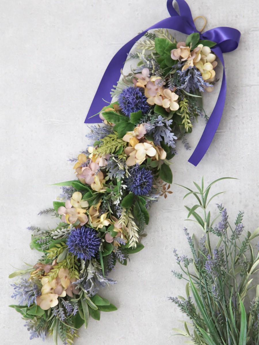 アーティフィシャルフラワー(造花)のラベンダーやルリ玉アザミ、ローズマリー等のグリーンを組んだ縦長ガーランド型の壁掛けアレンジです。
