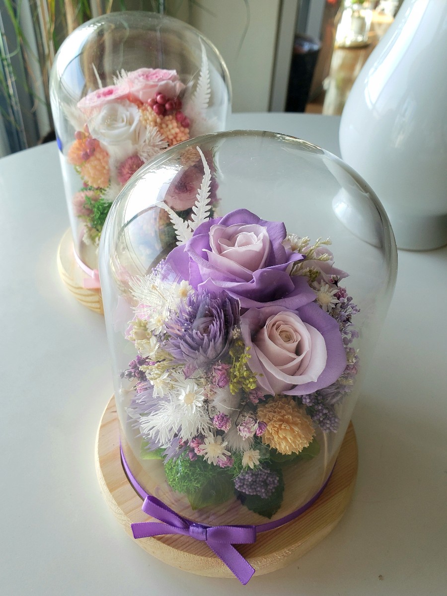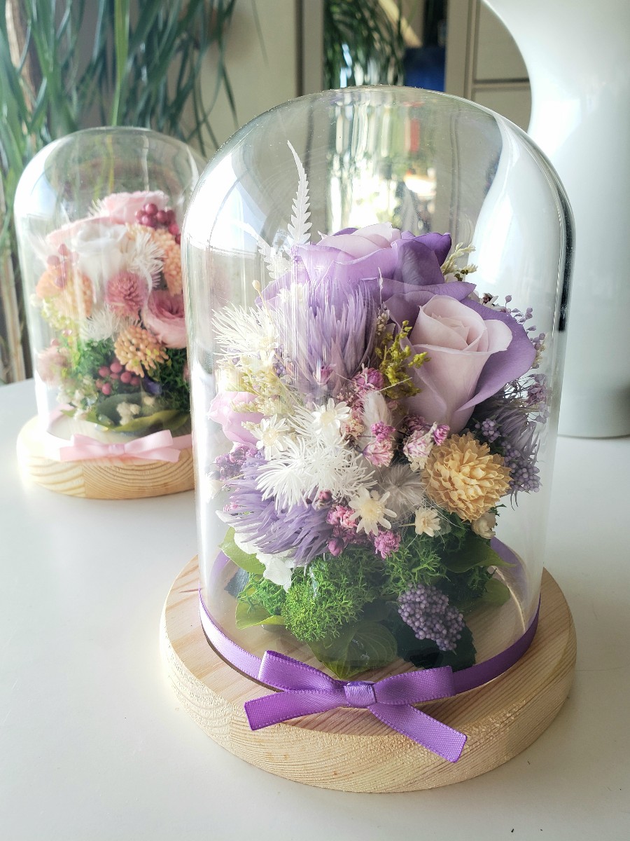 ガラスドームに淡いパープルの花材を閉じ込めた、優しいイメージのアレンジメントです。