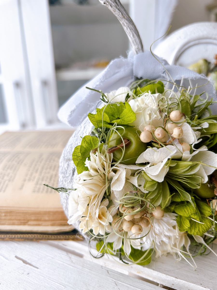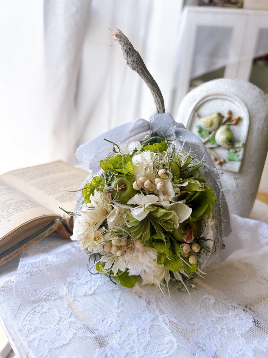 グリーンとホワイトのニゲラ、アジサイを中心に、爽やかなブッダナッツに仕上げました。りんごのピックが可愛らしいです。縁起物としてプレゼントにも最適で、根強い人気があります。インテリアとしても場所をとらず長く飾っていただけます。