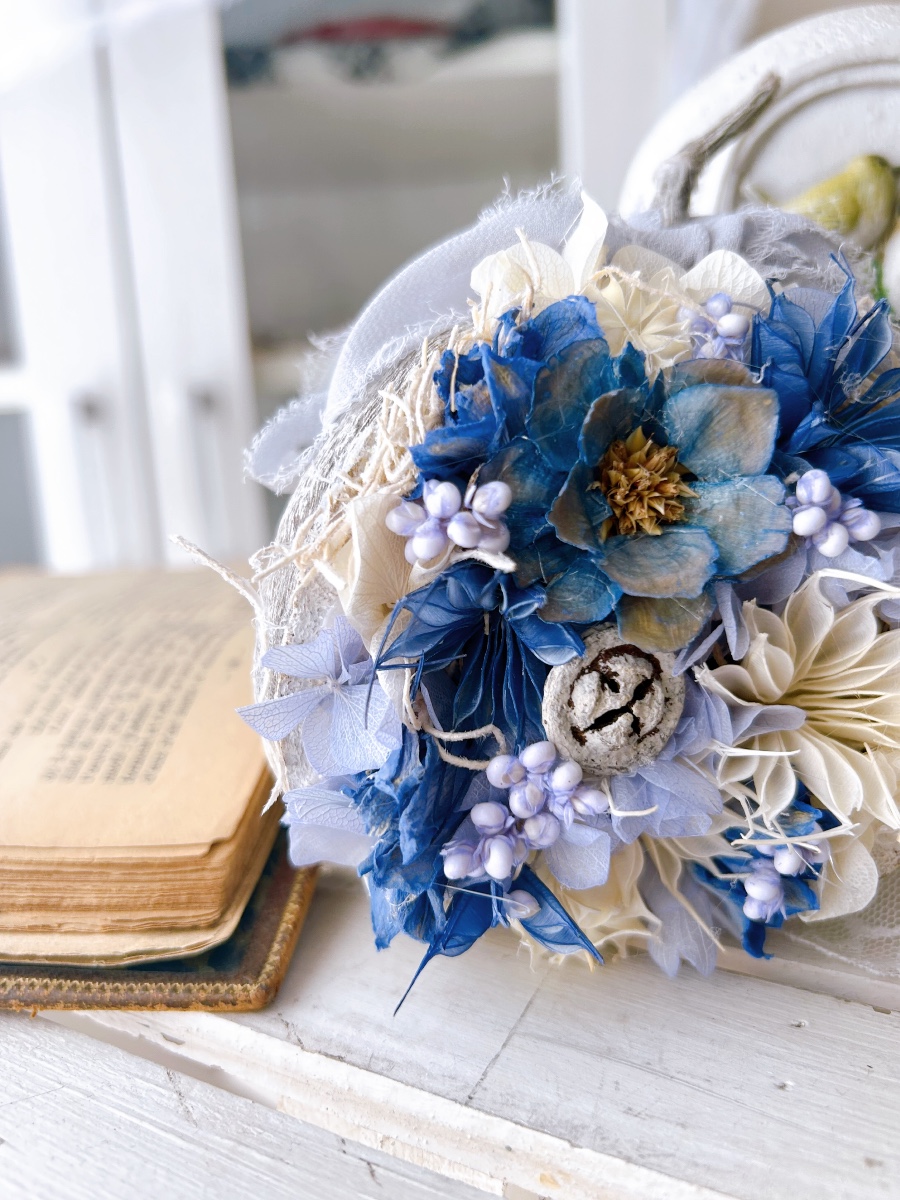 涼しげなブルーのアネモネのソラフラワー、ドライフラワーのニゲラ、プリザーブドフラワーのアジサイ。様々な花材をふんだんにナッツに閉じ込めた作品です。