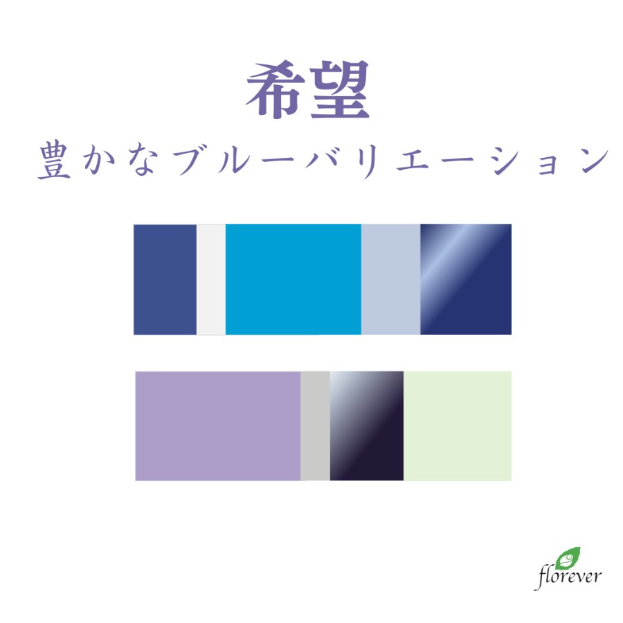 ブルー系の中にシルキーグレーが入っているところがポイントです。アレンジをお洒落で垢抜けた印象に引き上げてくれる、お役立ちカラーです。