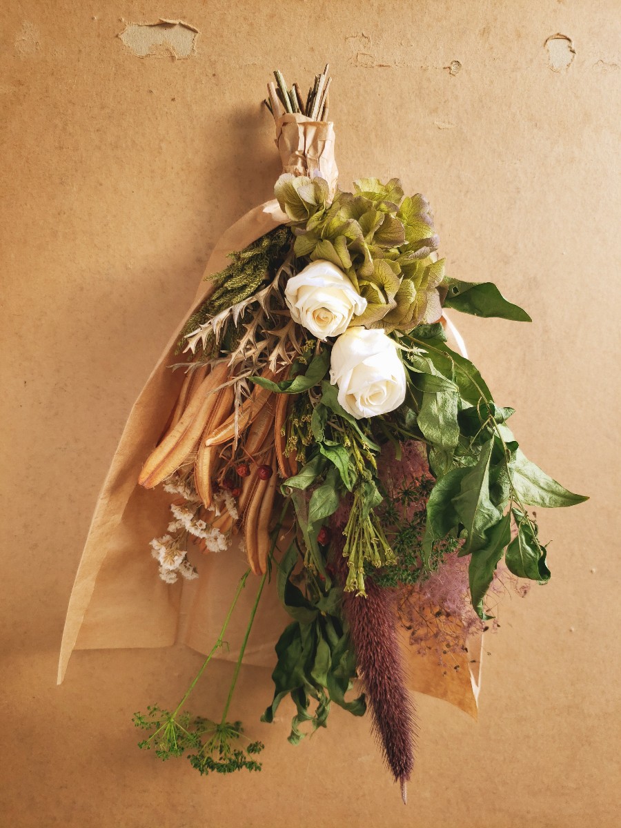 夜に強く香るヤコウボクをドライフラワーに仕上げました。同じドライフラワーにスモークツリー、クロキビ、グレビレアやヤマユリの実など個性的な素材を束ね、ポイントにプリザーブドフラワーのバラをあしらいました。