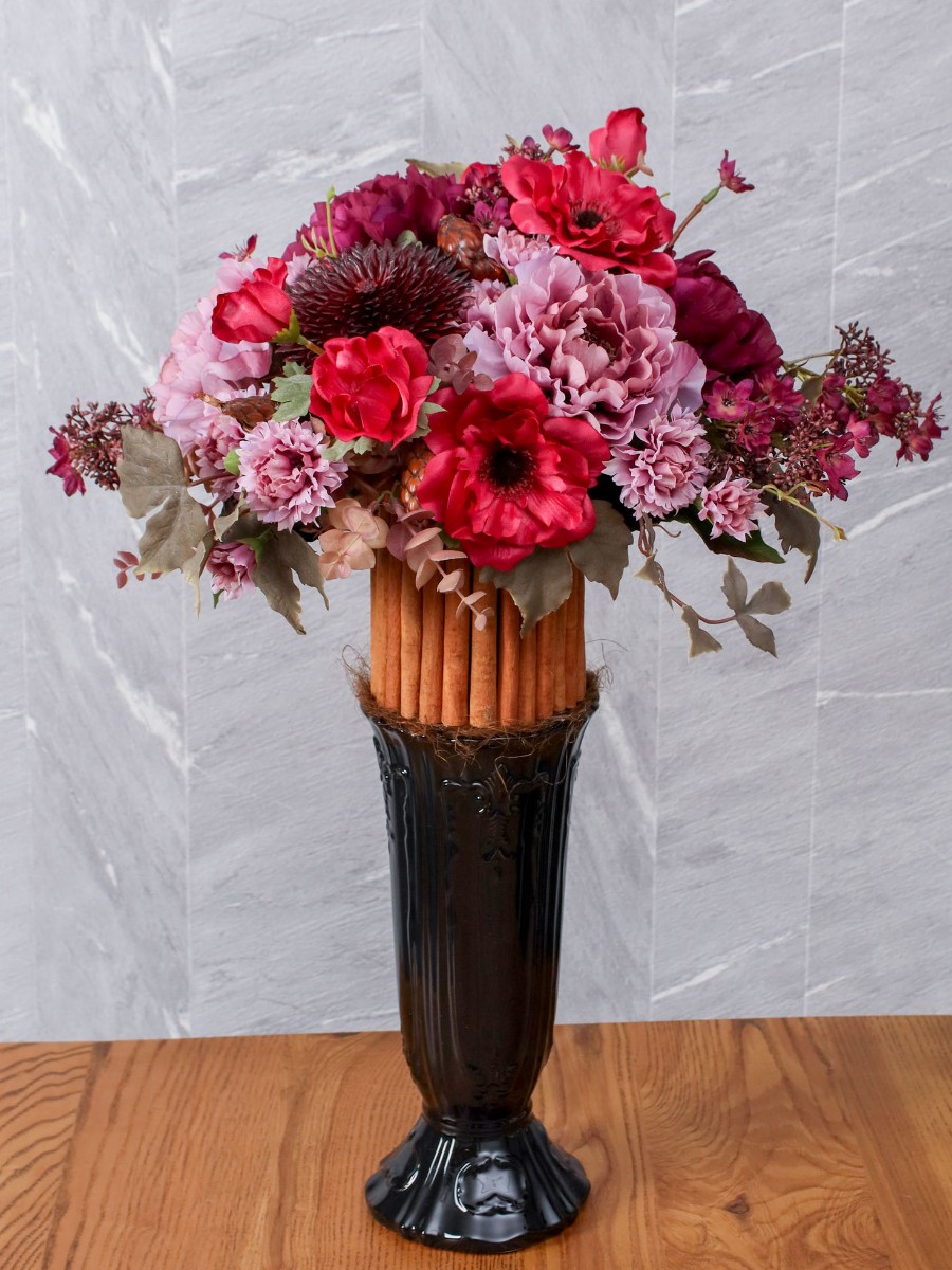 シナモンをポットに対し筒状に挿し、その上にクレールコレクションをアレンジしました。
