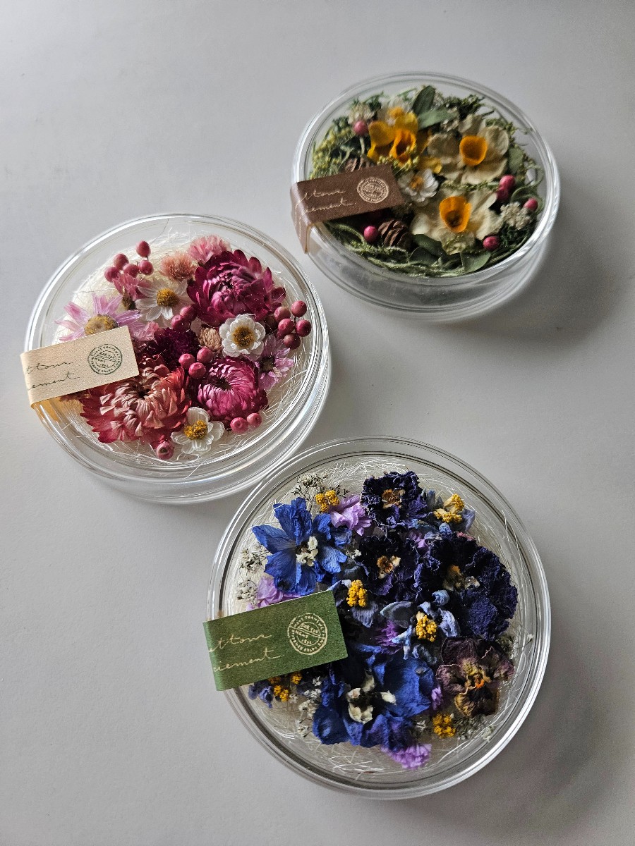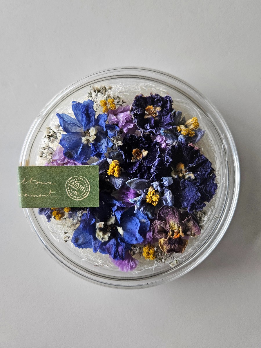 シャーレの中にドライフラワーのデルフィニウム、パンジー、ビオラ、スターチスなどを閉じ込めたナチュラルなアレンジメント。