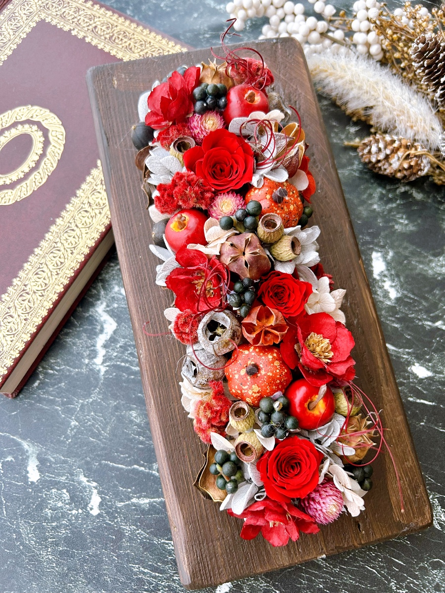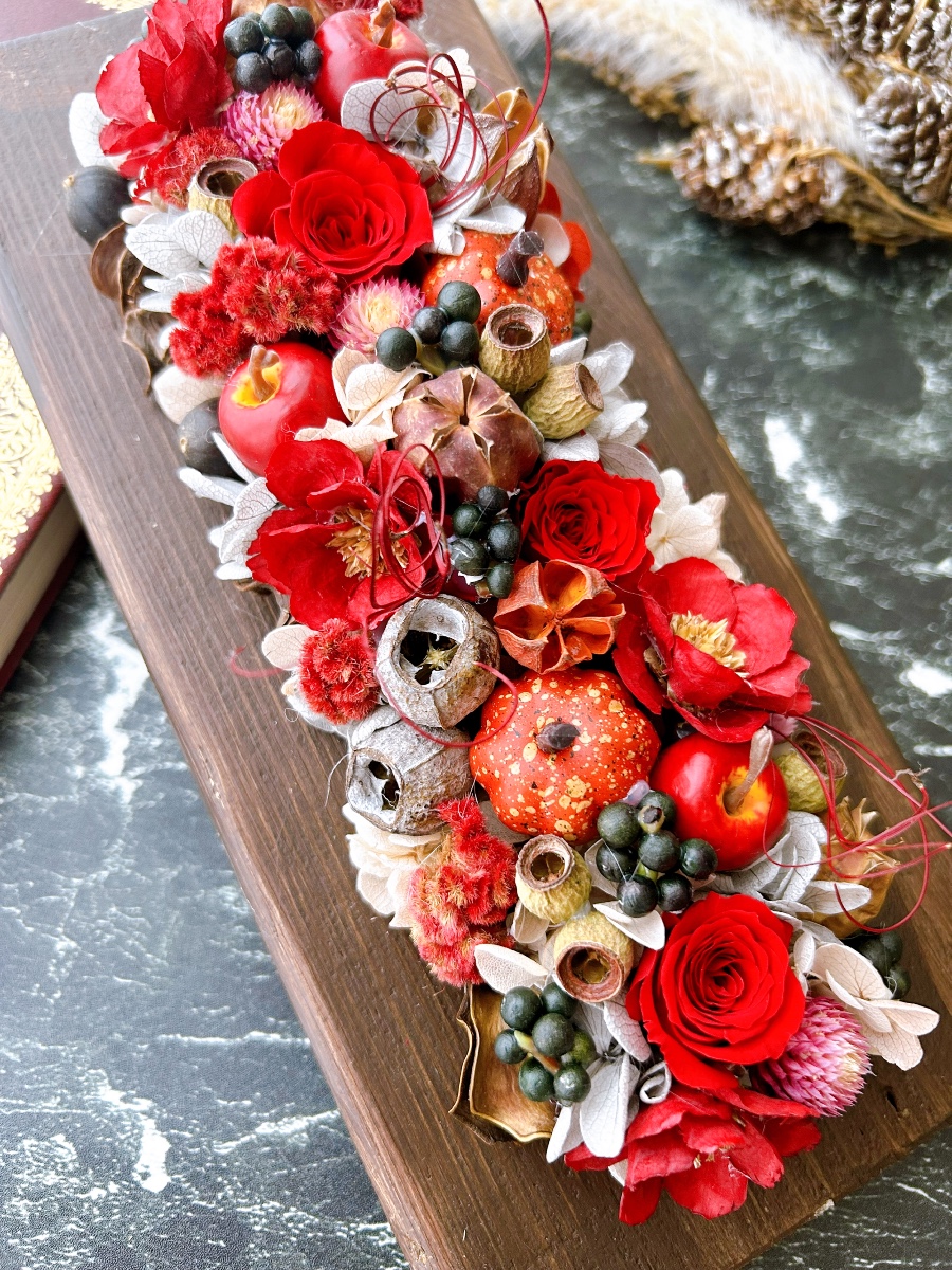 赤色バラのプリザーブドフラワー、かぼちゃやりんごのピックを使い、シックな秋色ボードフラワーです。