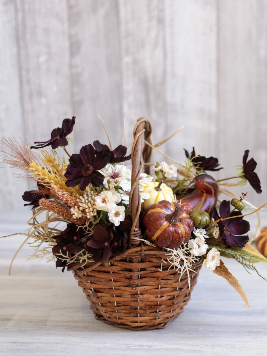 パンプキンは定番のオレンジ系ではなくブラウン系を選び、ウィートの小麦色からチョコレートコスモスまでのアースカラーグラデーションでまとめています。