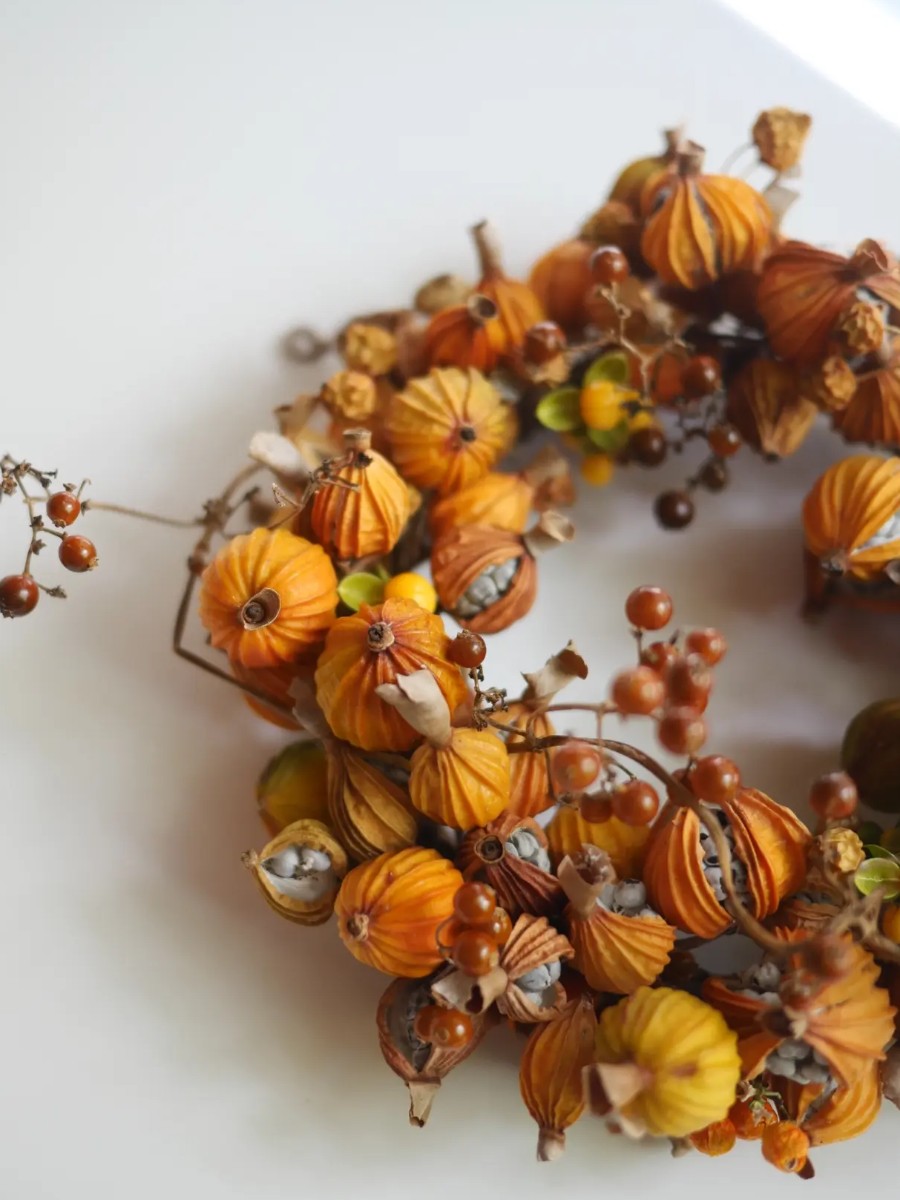 リースやブーケの中にストーリー性があり、草花が風にゆれる自然の景色をそのまま切り取ったかのような作品づくりをしています。