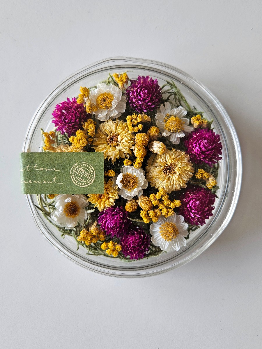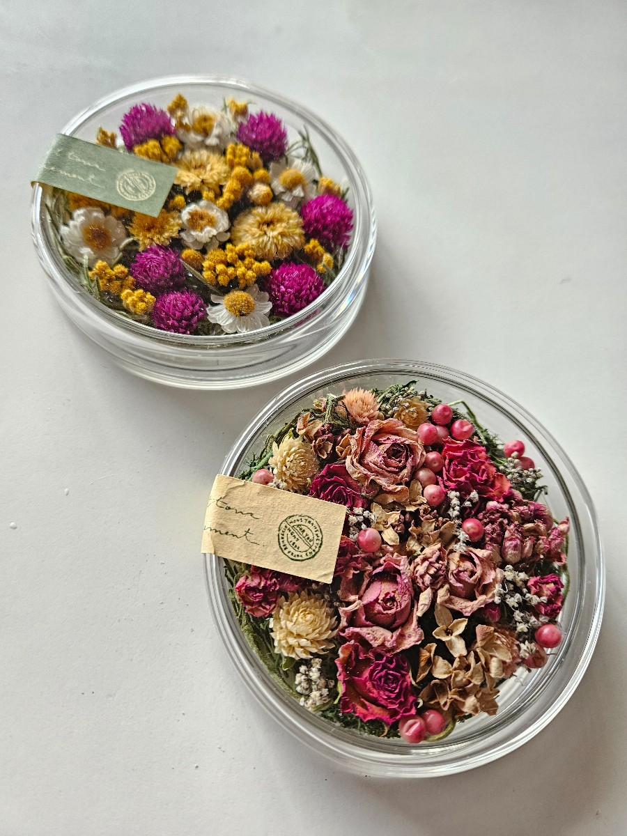 ドライフラワーのクッションマム、ハナカンザシ、センニチコウなどをシャーレに閉じ込めたアレンジメントです。