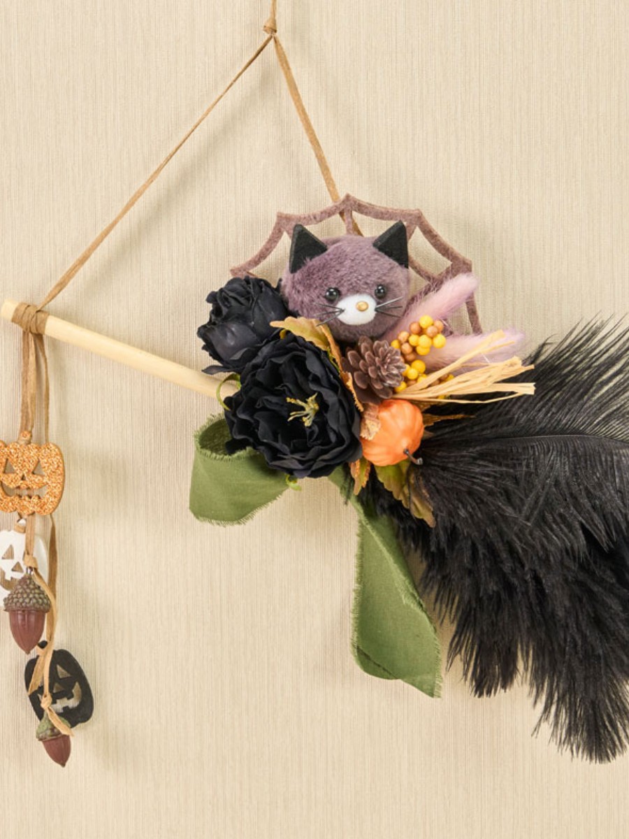 フェザーホウキを横に使い、猫がホウキに乗って空を飛んでいるようなデザインにしました。