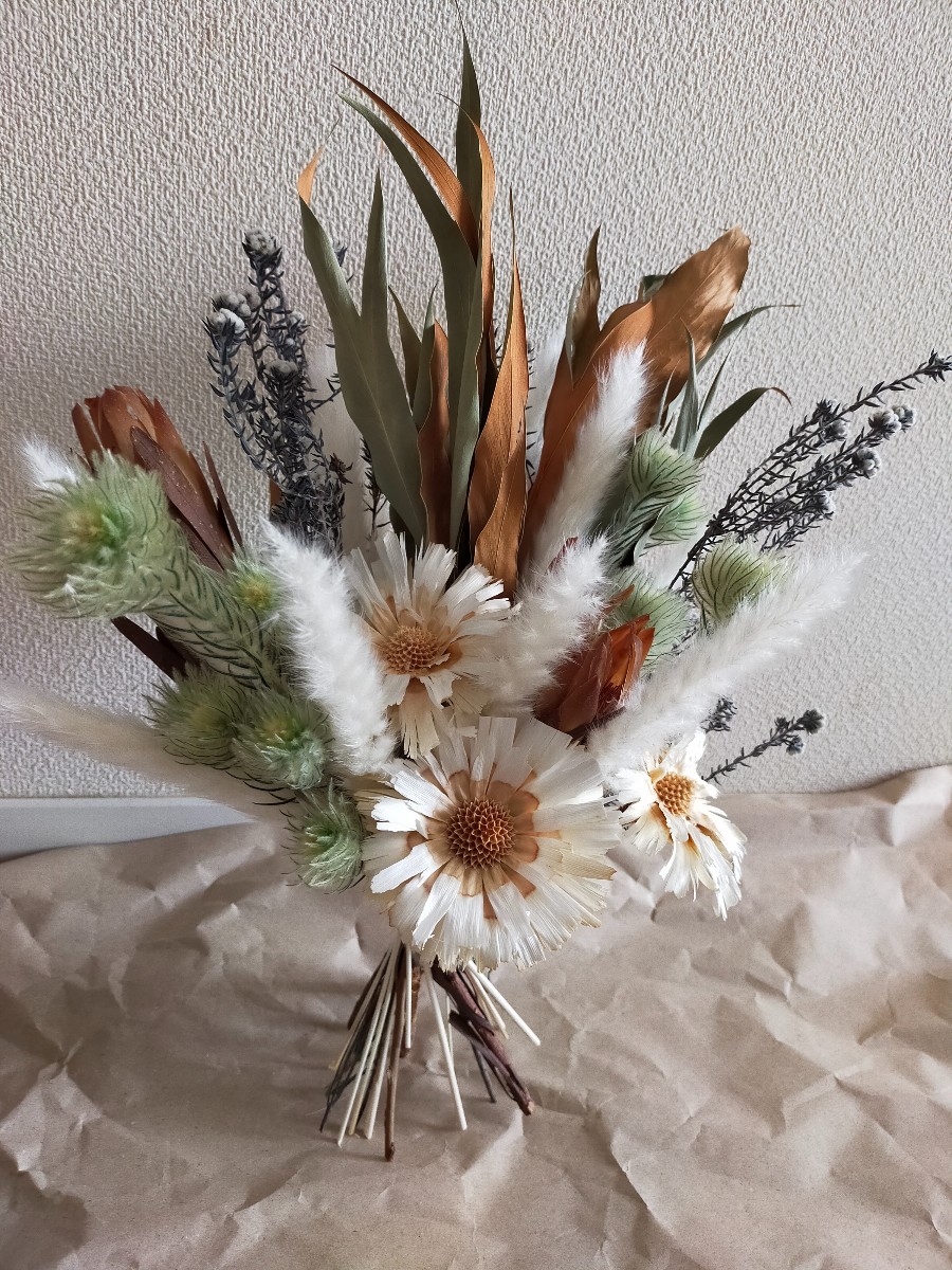 こちらで購入させていただきましたドライフラワーを束ねてみました。立てて飾っていますがスワッグとして吊るすこともできます。いろいろな種類のドライフラワーから色合いや種類を選ぶのが難しいですね。