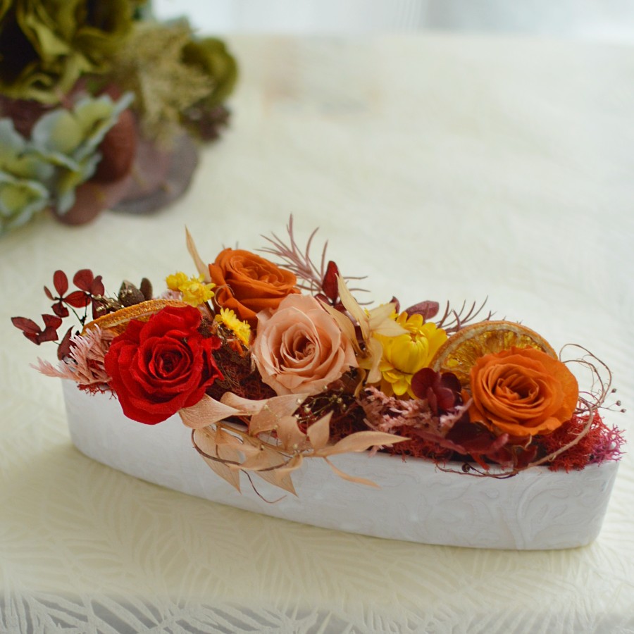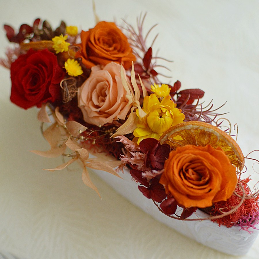 秋色に染まったプリザーブドフラワーをメインにドライの木の実やオレンジを添えて流れを出しています。