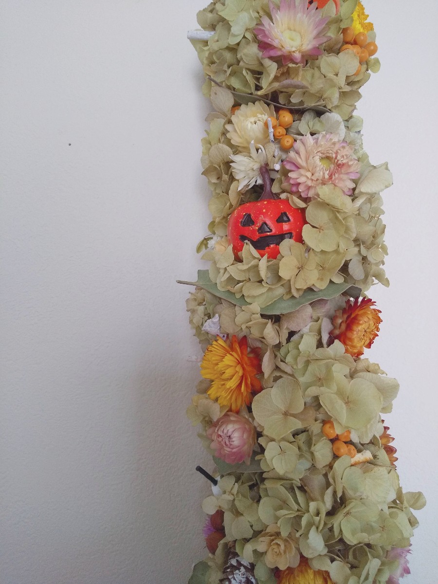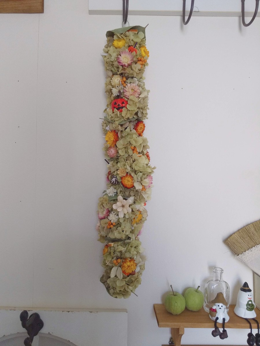 たくさんのドライフラワーを繋げたお花のガーランド。ハロウィンバージョン。
