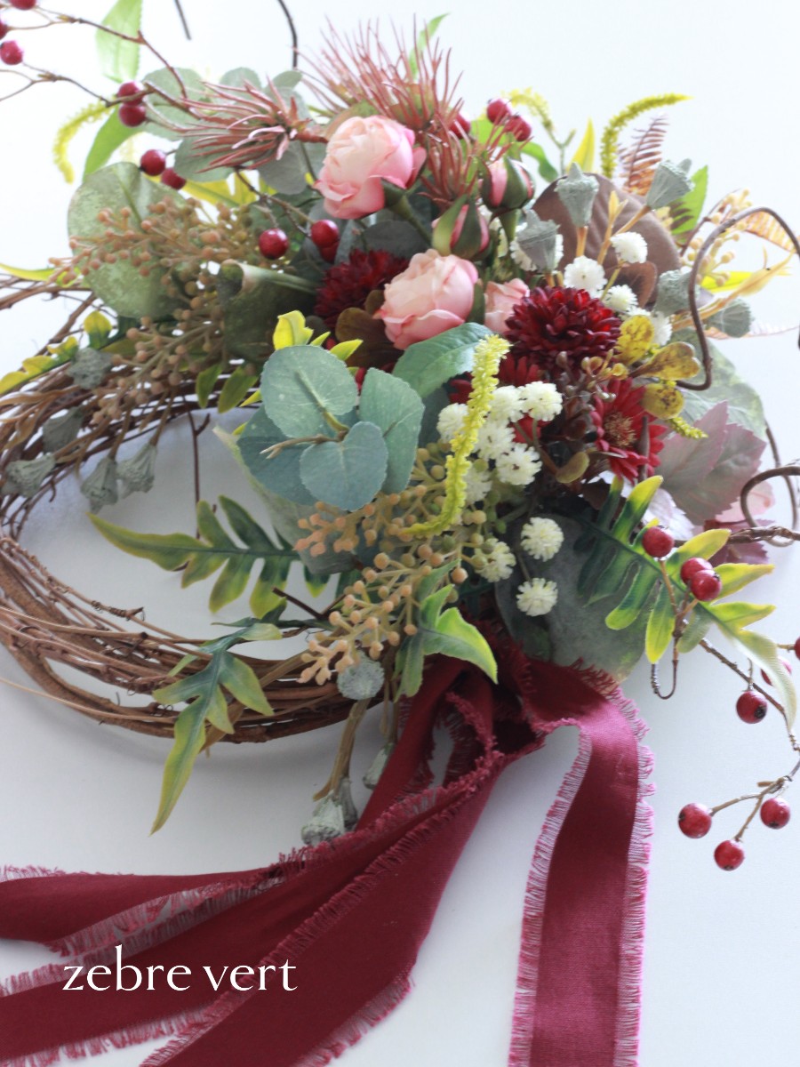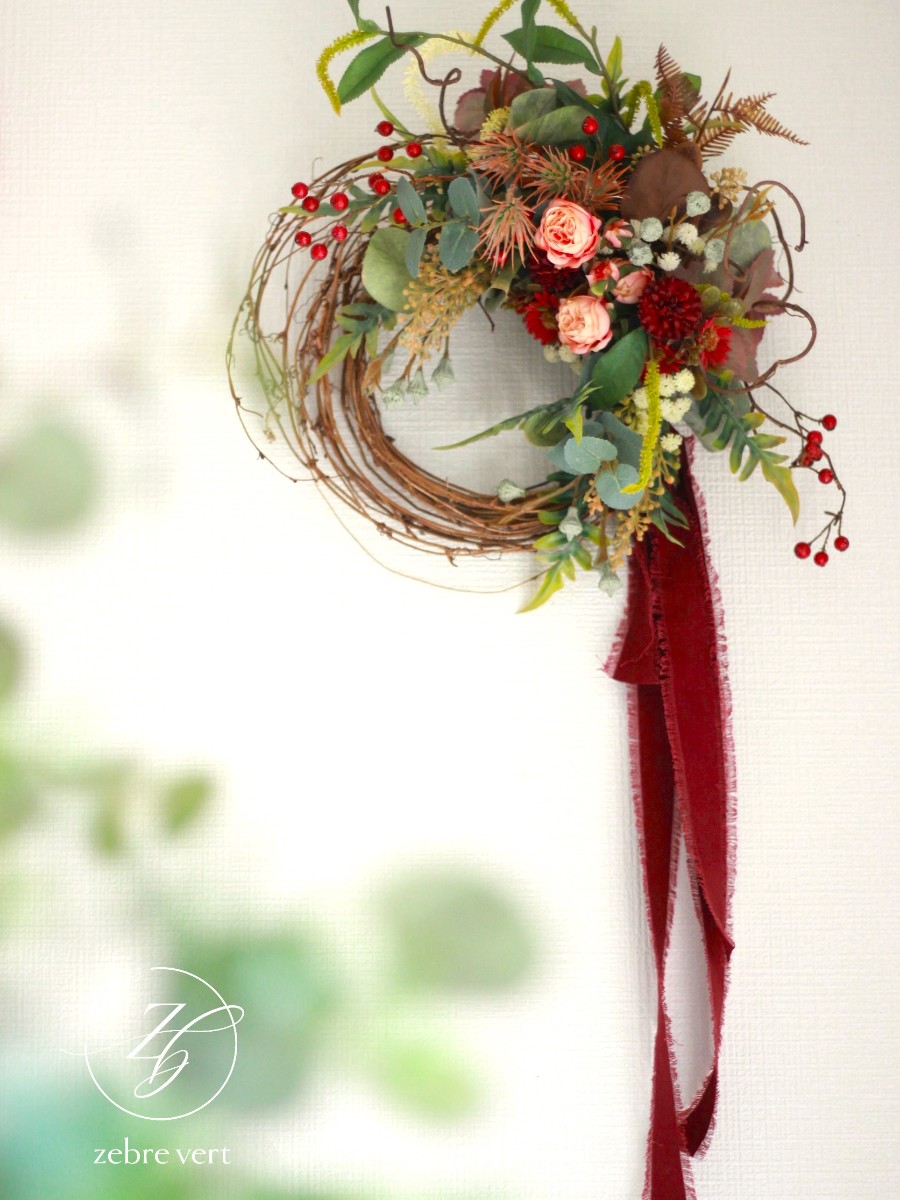 自然を身近に感じられるような『シャンペトルリース』。赤&ワイン&オレンジ、そしてグリーンや実物いっぱいで秋を表現しています。ワインカラーのコットンリボンを長く垂らすと華やかに。