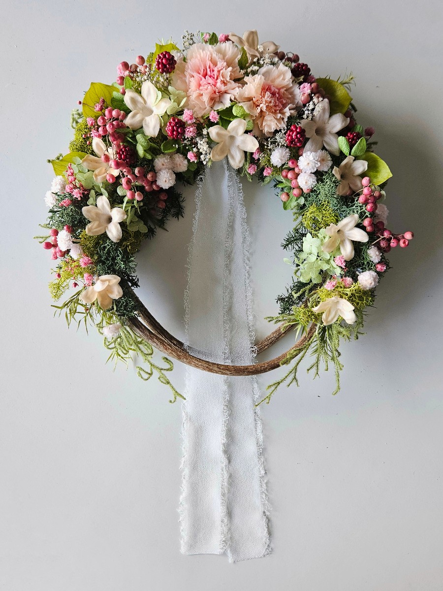 プリザーブドフラワーをメインにしようした、華やかなオーダーリースです。
