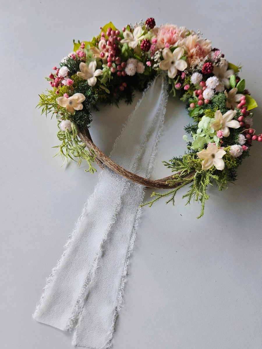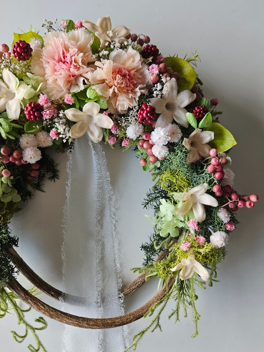 自家のバルコニーで栽培したもの、野山で採取したもの、生花店で購入した新鮮な切り花など…主に家で加工したドライフラワーを使い、その季節ごとにブーケやリース、アレンジメントなどを制作しています。