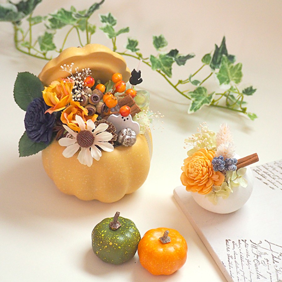 ほっこりかわいいパンプキンから、おばけちゃんと一緒に秋のお花やナッツが飛び出した!