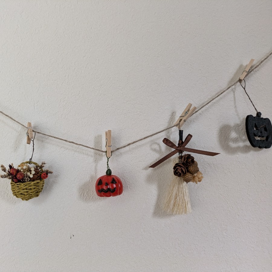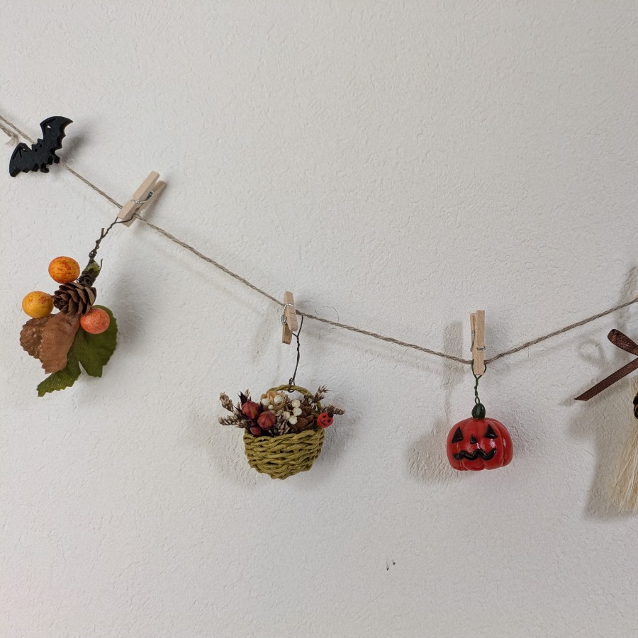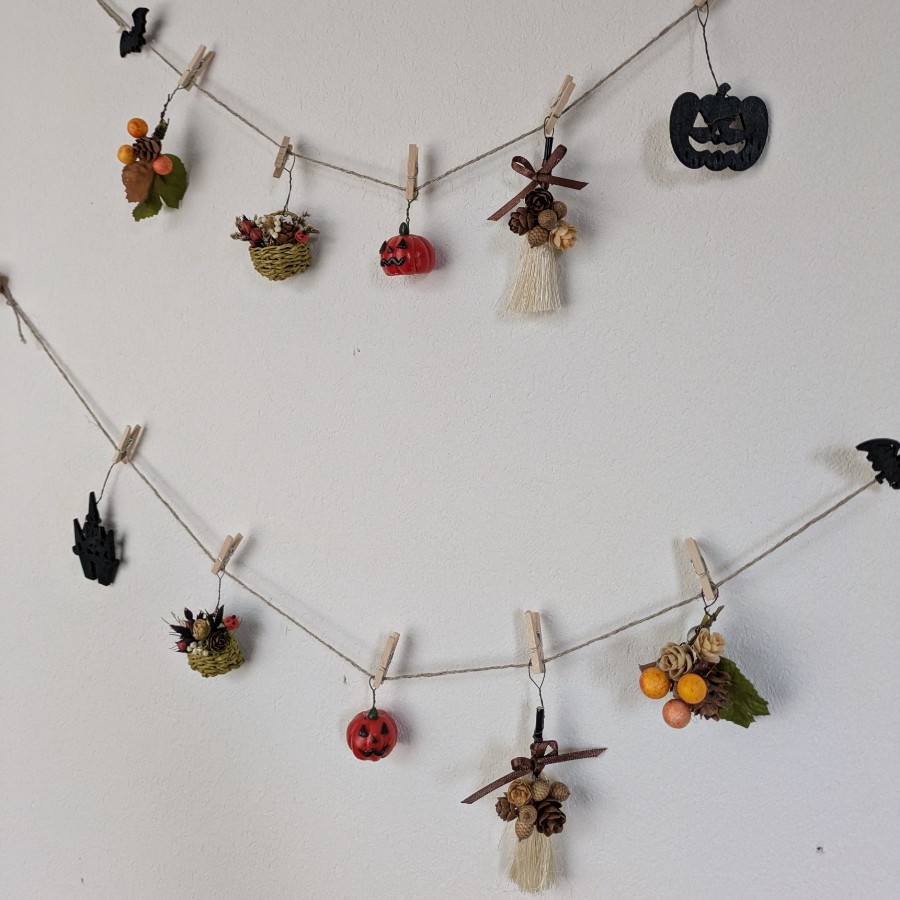 ハローウィンにむけて、、雑貨とプリザーブドフラワーや木の実を組み合わせて、ガーランドをつくりました。